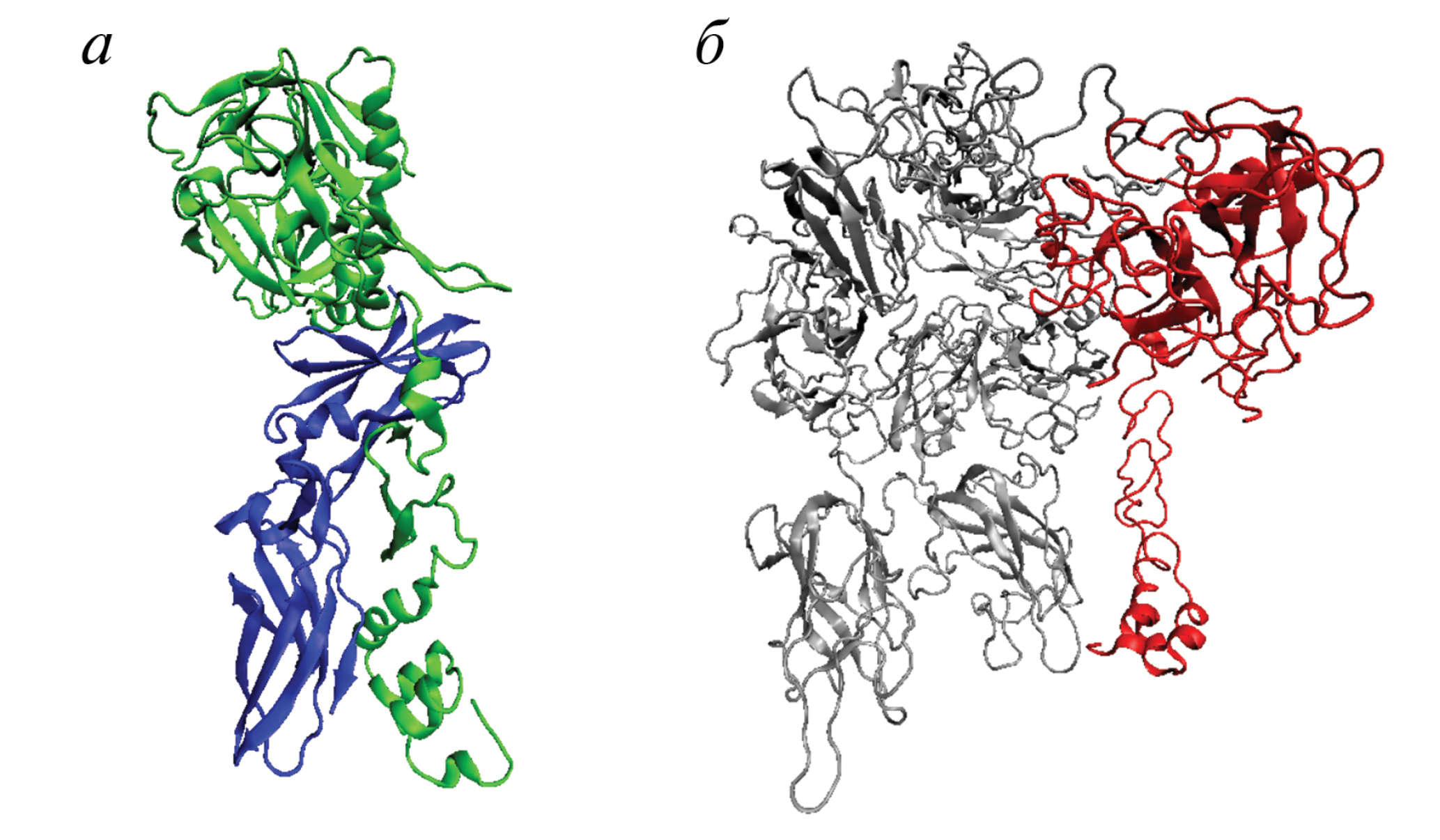 Рис. 4. Структуры ферментативных комплексов. а – Внешняя теназа. Зеленый – фактор VIIa; синий – TF. Визуализирована в VMD, PDB 1dan [59]. б – Протромбиназа. Серый – фактор Va; красный – фактор Ха. Визуализирована в VMD, PDB 7tpq [13].