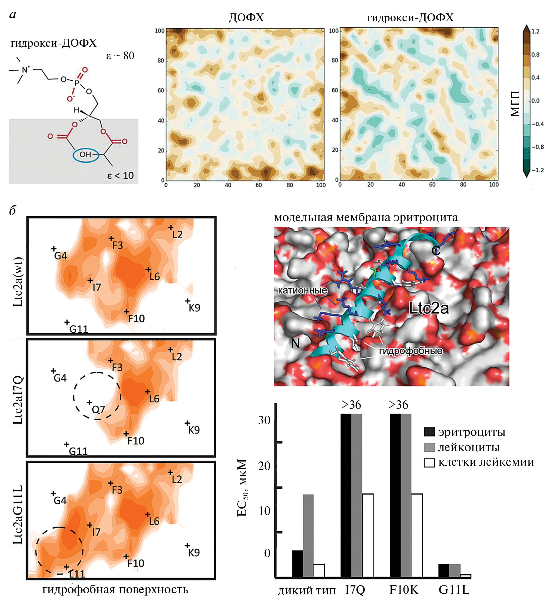 Рис. 4. Дизайн свойств бислоев и МАП. а – Схематичное изображение расположения молекулы sn-1-β-гидроксидиолеоилфосфатидилхолина (ДОФХ-oh) относительно мембраны, а также гидрофобная/гидрофильная организация поверхности бислоев ДОФХ и ДОФХ-oh (окраска по значениям МГП). Карты даны для одного липидного монослоя. Конфигурации системы взяты из МД-траекторий бислоев. Схема окраски для МГП показана справа. б – Двумерные карты гидрофобной поверхности в N-концевом участке для вариантов АМП Ltc2a с разной гемолитической активностью. Данные о цитотоксичности (в терминах полумаксимальной эффективной концентрации, ЕС50) дикого типа и мутантных АМП показаны в виде диаграммы. Также показана МД-конфигурация Ltc2a дикого типа на поверхности модельной полноатомной мембраны эритроцитов (ПОФХ 40%, ПОФЭ 40%, холестерин 20%).