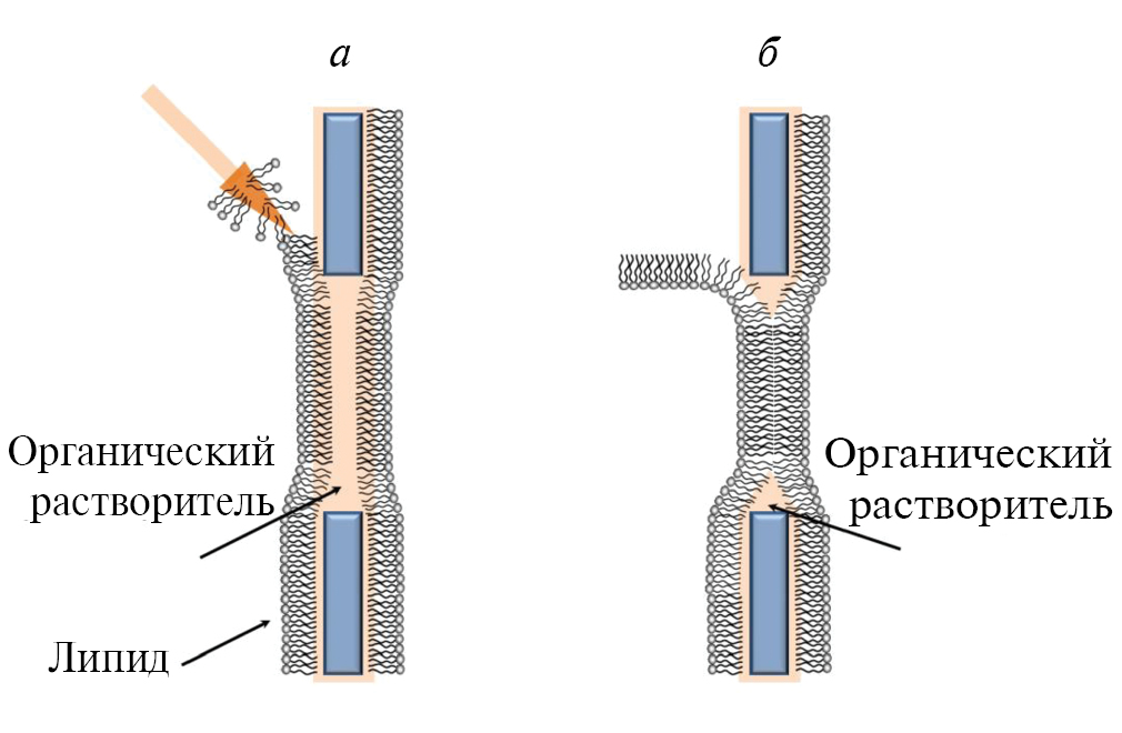 Рис. 1. Схематическое представление формирования плоских липидных мембран по методу Мюллера–Рудина (а) и Монтала–Мюллера (б) [5].