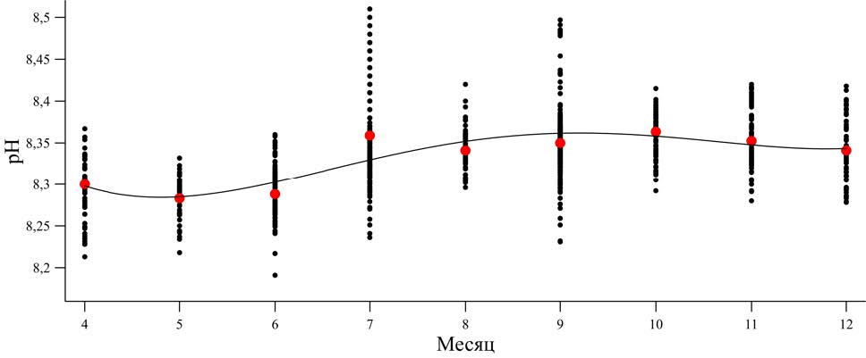 Внутригодовой ход средних значений рН поверхностных вод северной части Черного моря можно разделить по полугодиям. С июля по декабрь рН практически постоянна и изменяется в пределах 8,34–8,36 ед. (стандартное отклонение 0,01 ед. рН, что не превышает погрешности метода измерений и статистически незначимо). Минимальные средние значения наблюдаются в весенний период, составляя в мае – июне 8,29 ± 0,01 ед. рН (рис. 7). Затем рН снова начинает расти, достигая значений второго полугодия.