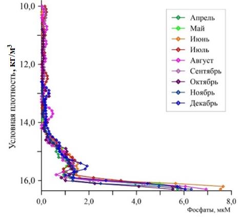 Содержание фосфатов после появления оксиклина на σt = 14,4–14,5 кг/м3 постепенно увеличивается с глубиной, достигая концентраций > 1 мкМ на σt = = 15,5 кг/м3. Затем концентрация уменьшается и составляет ˂ 0,5 мкМ при σt = = 15,8 кг/м3, далее монотонно увеличивается до 6,5–8,0 мкМ на изопикнической поверхности 16,2 кг/м3.