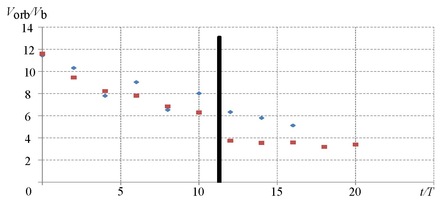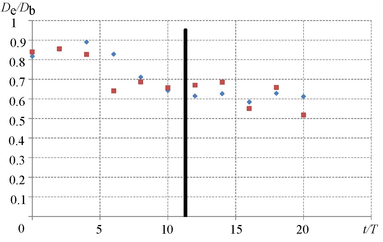 Р и с. 7. Зависимость от t⁄T. Синие ромбы – эксперимент над конусом с гладкой поверхностью, красные квадраты –- эксперимент над конусом с выступом в виде хребта; толстая черная линия – момент времени, когда фронт вихревого течения проходит над хребтом 3. Соленость воды в бассейне S=2 ‰