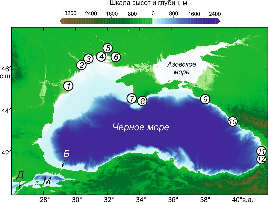 Fig.1. Location of the coastal tide gauges the data of which were used in the study: 1–12 are the station numbers. Other designations: М is the Sea of Marmara, Б is the Bosphorus, Д is the Dardanelles