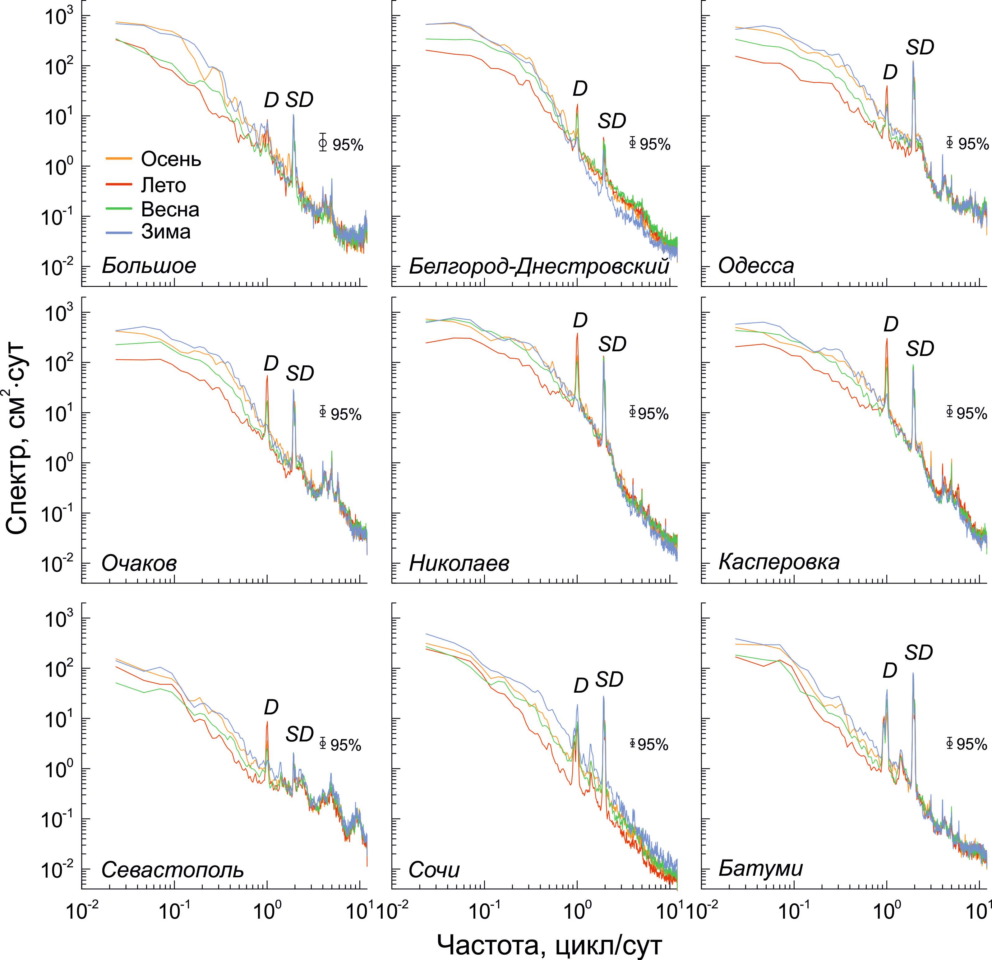 Характер сезонной изменчивости спектров сильно различается в зависимости от частоты. В низкочастотном диапазоне (< 0,8 цикл/сут) наблюдается существенная разница в энергии зимних и летних спектров. Для восточного побережья моря (Батуми и Сочи) характерно увеличение спектральной плотности от лета к зиме и уменьшение от зимы к лету. Причем в осенний и весенний сезоны спектры имеют близкий уровень энергии. Для северо-западного (Очаков, Одесса и Большое) и Крымского побережий уровень спектральной плотности осенью и зимой почти не различается, далее снижаясь к весне и лету. На станциях Николаев, Касперовка и Белгород-Днестровский, расположенных в лиманах крупных рек (Южный Буг, Днепр и Днестр соответственно), уровень спектральной плотности зимой, осенью и весной имеет близкие значения. Увеличение спектральной плотности в осенне-зимний период связано с интенсификацией циклонической активности в атмосфере. В лиманах крупных рек подобного зимнего усиления не наблюдается, видимо, из-за ледяного покрова, который частично демпфирует синоптические колебания уровня моря.