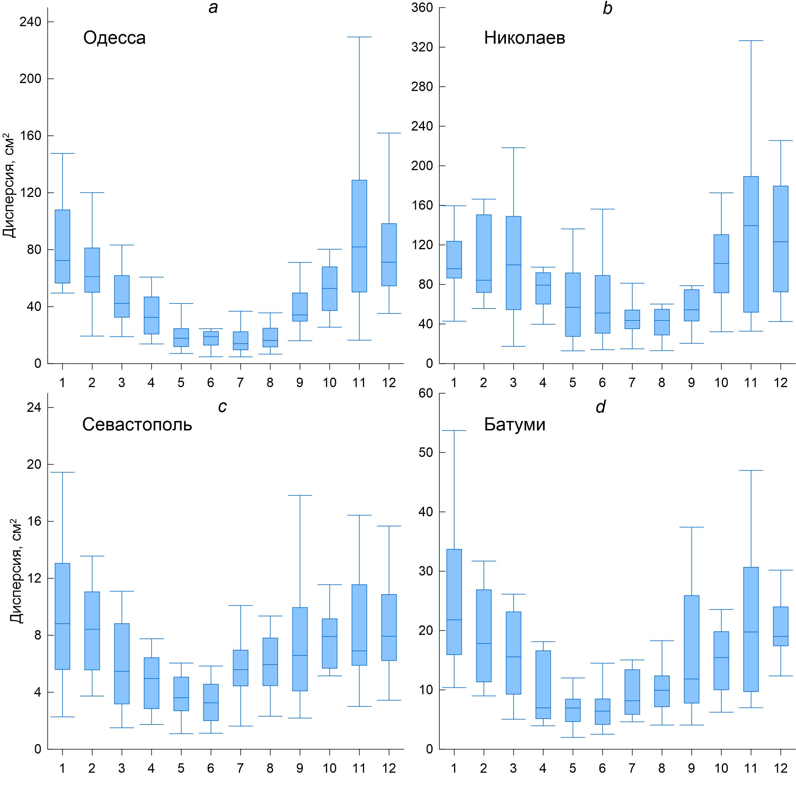 На рис. 3 показаны рассчитанные диаграммы размаха («ящики с усами») оценок дисперсии синоптических колебаний уровня для станций Одесса, Николаев, Севастополь и Батуми. Для всех четырех станций характерны высокие значения дисперсии в осенне-зимний период и пониженные в летний. Причем в глубоководных частях моря (Севастополь и Батуми) минимум дисперсии наблюдается в мае – июне, в Одессе этот период шире – с мая по август, а в Николаеве смещается к концу лета, на июль – август. Межгодовой разброс оценок дисперсии с ноября по январь также существенно выше, чем в другие месяцы. В северо-западной части моря (рис. 3, a, b) максимальное медианное значение дисперсии так же, как и разброс экстремальных значений, достигает своего максимума в ноябре. В Николаеве, вероятно, сказывается влияние речного стока, повышающего разброс оценок дисперсии в мае – июне. В Севастополе и Батуми максимальные значения медианы наблюдаются в январе (рис. 3, с, d). В сентябре на этих станциях отмечается локальное повышение как медианной оценки, так и разброса.