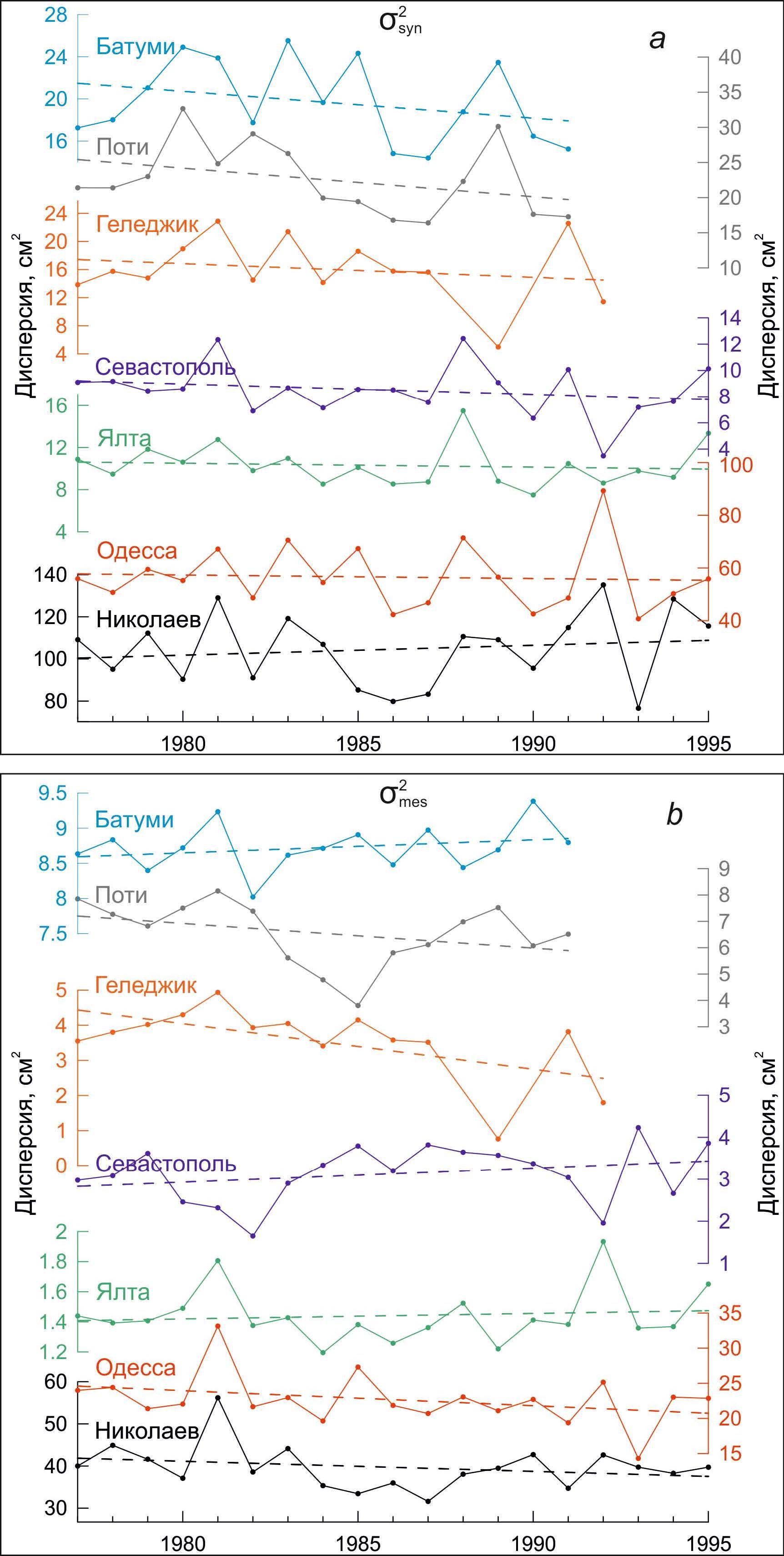 Рис.5. Межгодовые изменения дисперсии синоптических (a) и мезомасштабных (b) колебаний уровня Черного моря на станциях Батуми, Поти, Геленджик, Севастополь, Ялта, Одесса и Николаев. Штриховой линией показаны долгосрочные линейные тренды