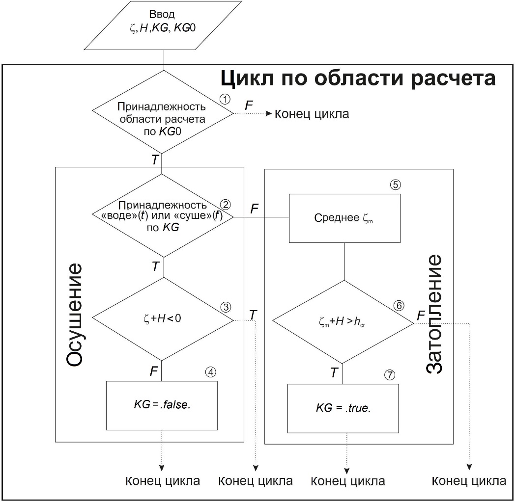 На рис. 1 представлена блок-схема алгоритма определения береговой линии водоема в случае сгонно-нагонных явлений. Алгоритм основан на определении глубины водоема в зависимости от значения перепада уровня водной поверхности. При переборе всех расчетных ячеек по значениям логической переменной KG0 сразу отбрасываются те, что заведомо не входят в расчетную область (KG0 = false). Затем по переменной KG определяется, какой процесс в ячейке идет: осушение, затопление или с ячейкой ничего не происходит.