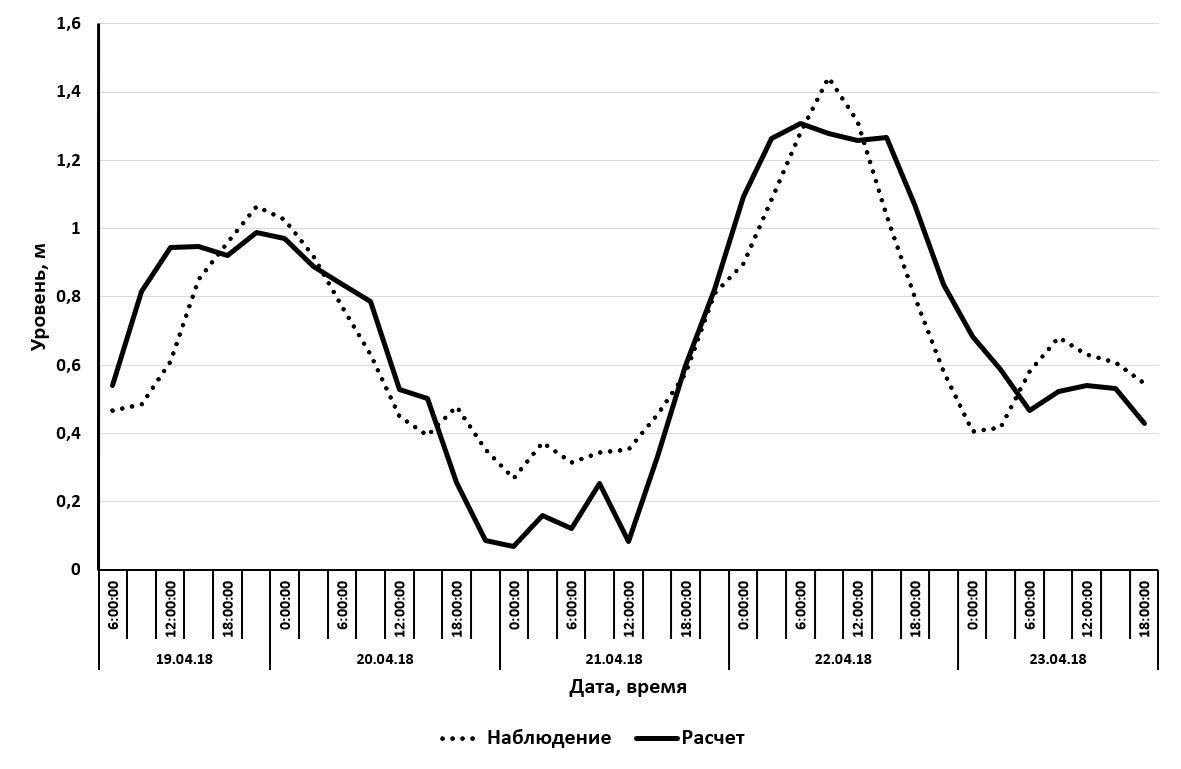 В начале периода с 19.04.2018 по 23.04.2018 дул ветер западных направлений скоростью 9–11 м/с. Затем он сменил направление на северное и ослабел до 4–6 м/с, но потом снова усилился до 11–13 м/с и стал юго-западным. Это привело к повторному увеличению нагона. На рис. 2 приведены расчетные и измеренные колебания уровня воды на гидропосту Донской с 19.04.2018 по 23.04.2018. Сравнение измеренных и расчетных значений уровня воды в хуторе Донском показало, что погрешность расчетов составляет 23 %.