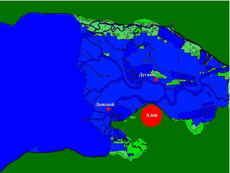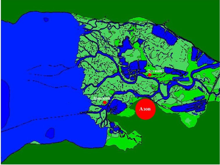 Рис.5. Схема зоны подтопления дельты р. Дон 24.09.2014 (выделена штриховкой). Выполнил А. Ю. Московец