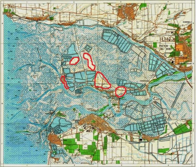Fig.5. Scheme of the flooded zone of the river Don delta on 24.09.2014 (highlighted by hatching) performed by A. Yu. Moskovets