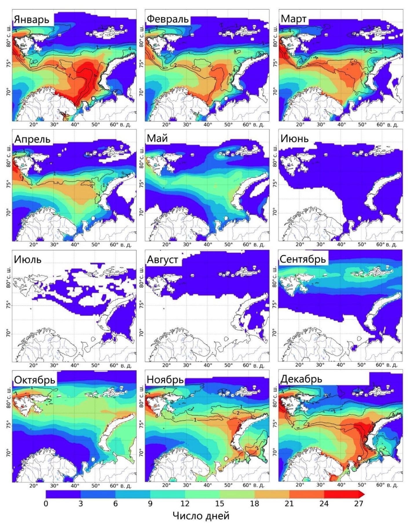 Далее рассмотрим годовой ход числа дней с брызговым обледенением в Баренцевом море (рис. 4). Для каждого месяца года построены карты числа дней с морским обледенением. Результаты показали, что наибольшее количество дней с обледенением наблюдается с октября по апрель. На наиболее благоприятных для обледенения территориях это явление в среднем наблюдается почти каждый день (более 27 дней в месяц). Наименьшее количество дней с обледенением наблюдается в июле.