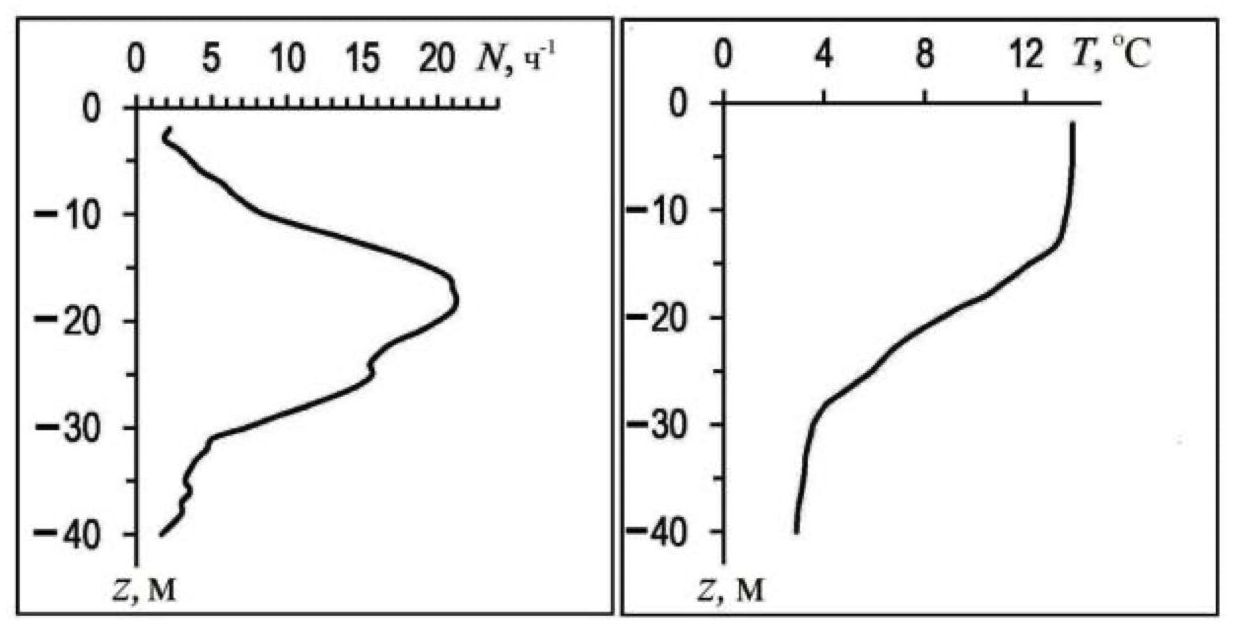 Р и с. 3. Среднесуточные профили частоты плавучести (N) (слева) и температуры (T) (справа) в районе расположения буйковой станции
