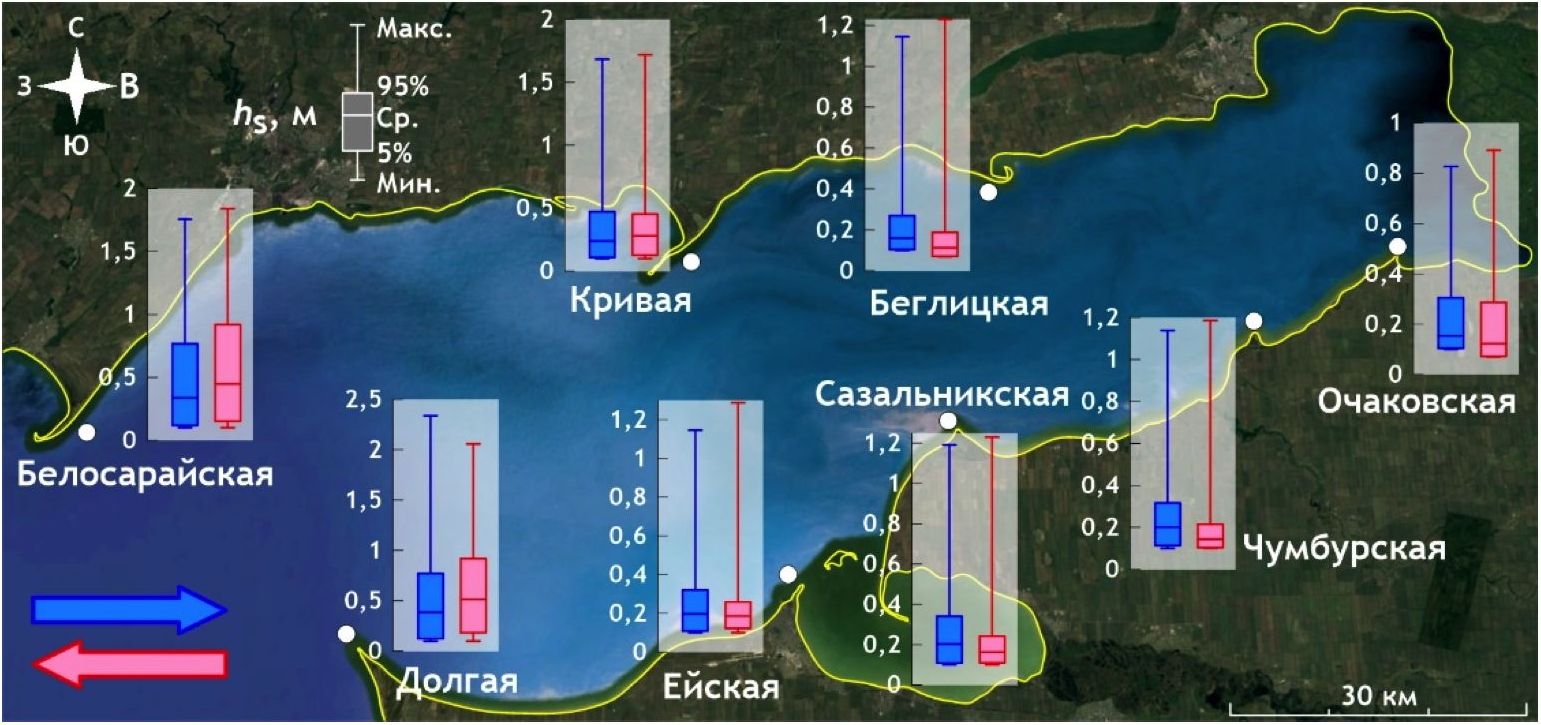 - В прибрежных водах Белосарайской и Кривой кос (северное побережье) высоты волн восточных направлений несколько превосходят как по средним, так и по максимальным показателям высоты при волнении западных румбов. Косы Беглицкая (северное побережье), Очаковская, Чумбурская, Сазальникская и Ейская (южное побережье) испытывают в среднем доминирование волнения западного направления, но волнение с максимальными высотами волн развивается при восточных штормах.