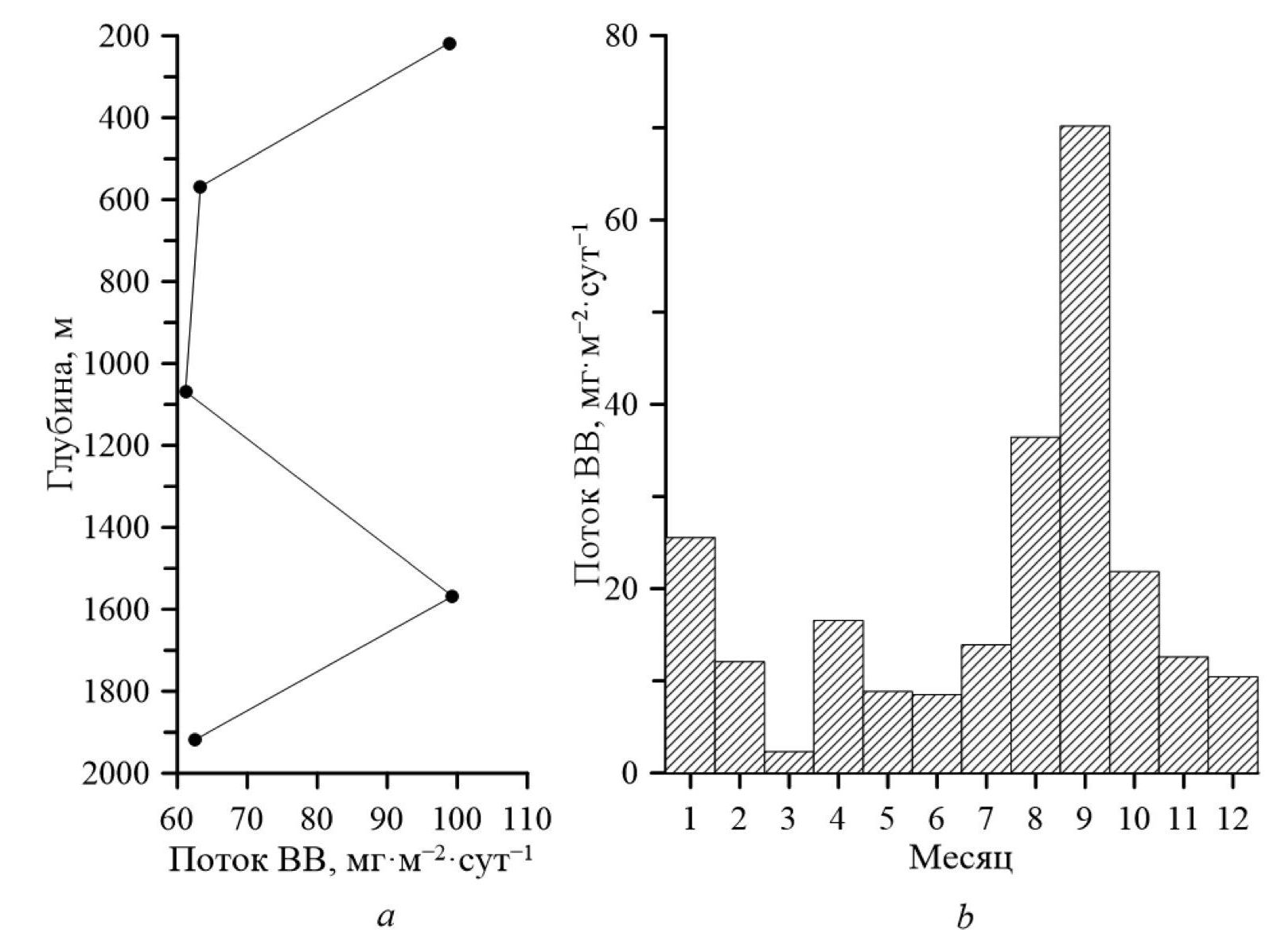 Сезонная изменчивость потока ВВ на глубине 218 м характеризовалась максимумом в сентябре (70,2 мг·м‒2·сут‒1 в пересчете на 30 дней) и минимумом в марте (2 мг·м‒2·сут‒1) (рис. 2, b). В целом значения потока ВВ изменялись в пределах 9–36 мг·м‒2·сут‒1, что также соответствует литературным данным [1, 16–18].