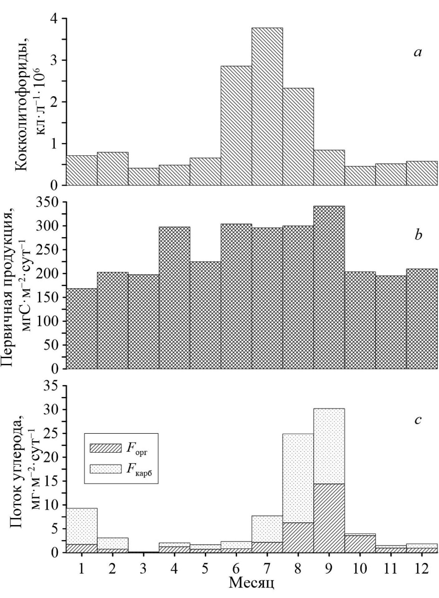 Таким образом, сезонная динамика потока ВВ преимущественно совпадает с динамикой первичной продукции и численностью кокколитофорид (рис. 5) [9, 26].