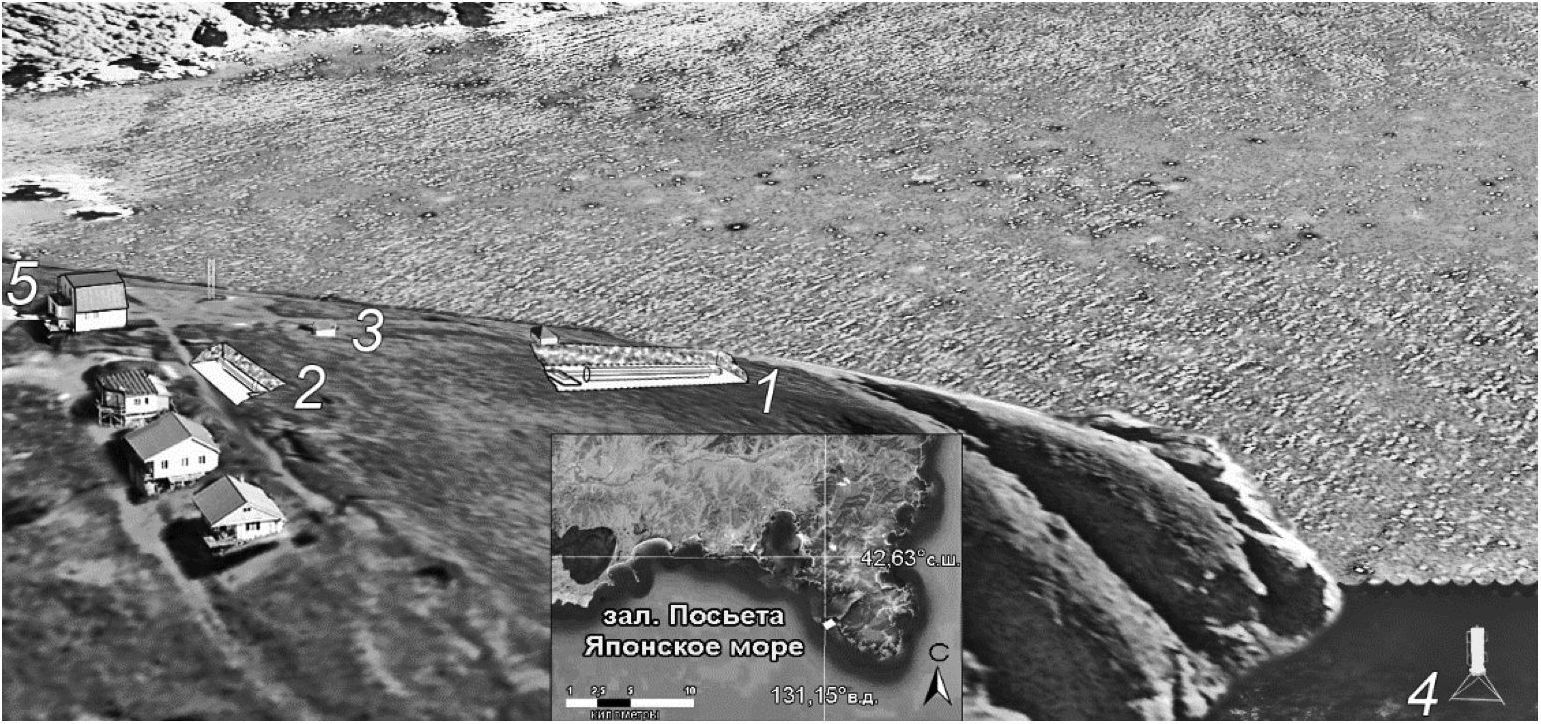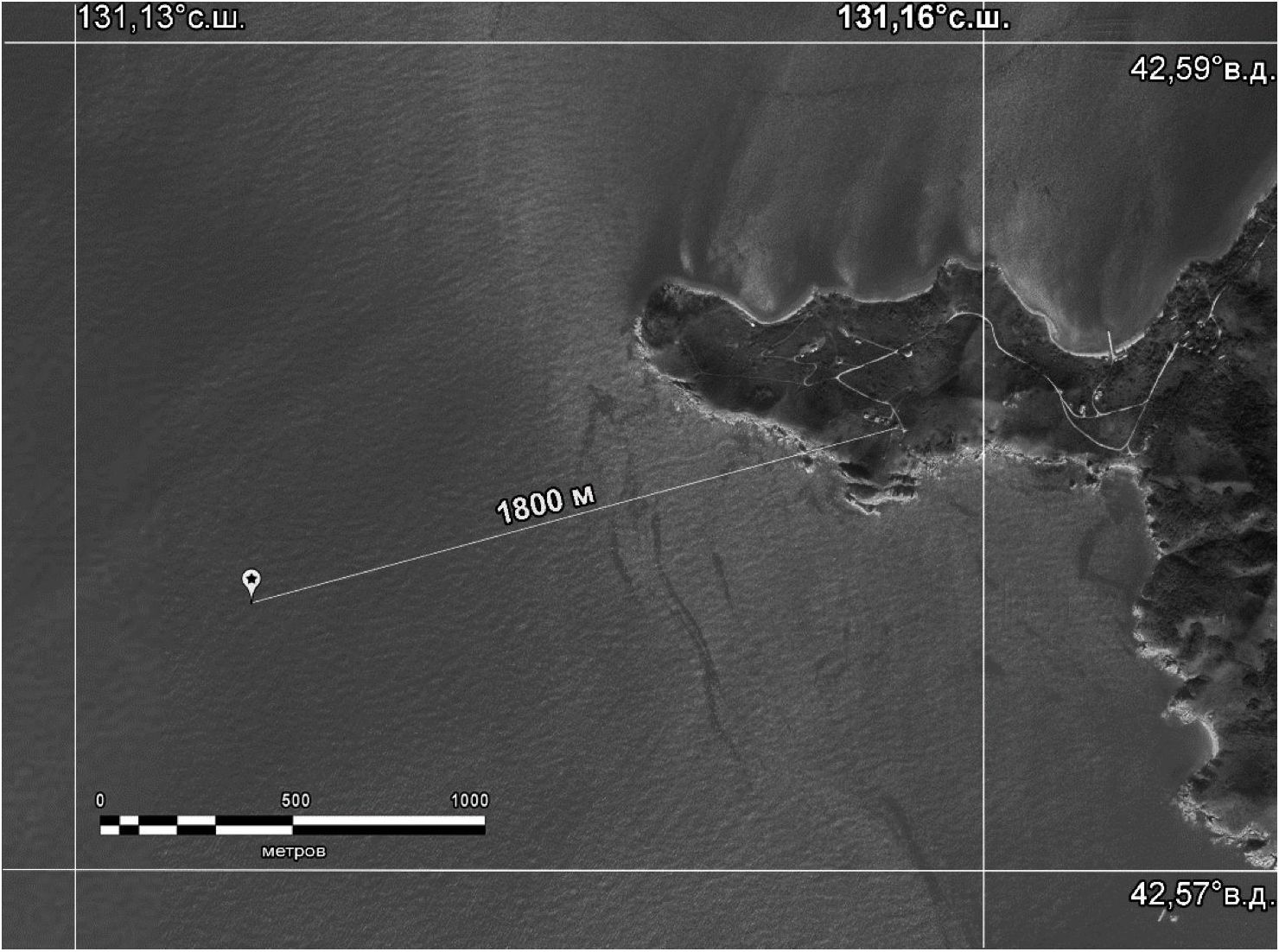Данный комплекс состоит из лазерно-интерференционных установок для измерения деформации земной коры и вариаций атмосферного давления, стационарного газоаналитического оборудования и метеостанции. При проведении эксперимента по изучению связи динамики парниковых газов шельфовой области Японского моря с вариациями деформаций земной коры в отдельный промежуток времени НИС «Профессор Гагаринский» стоял на якоре на шельфе Японского моря в 1,8 км от места расположения лазерного деформографа (рис. 1).