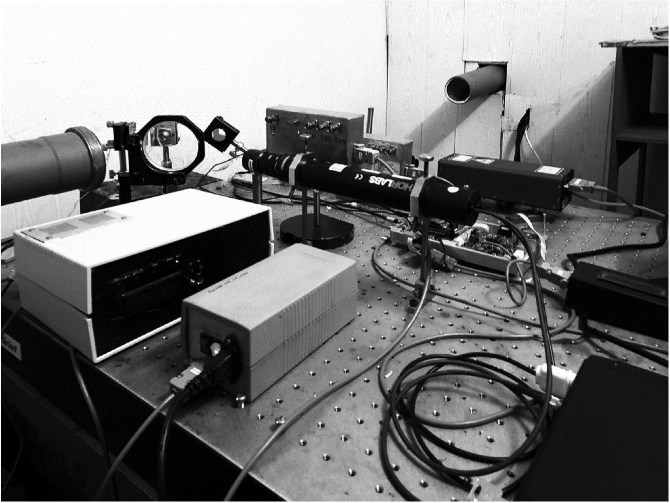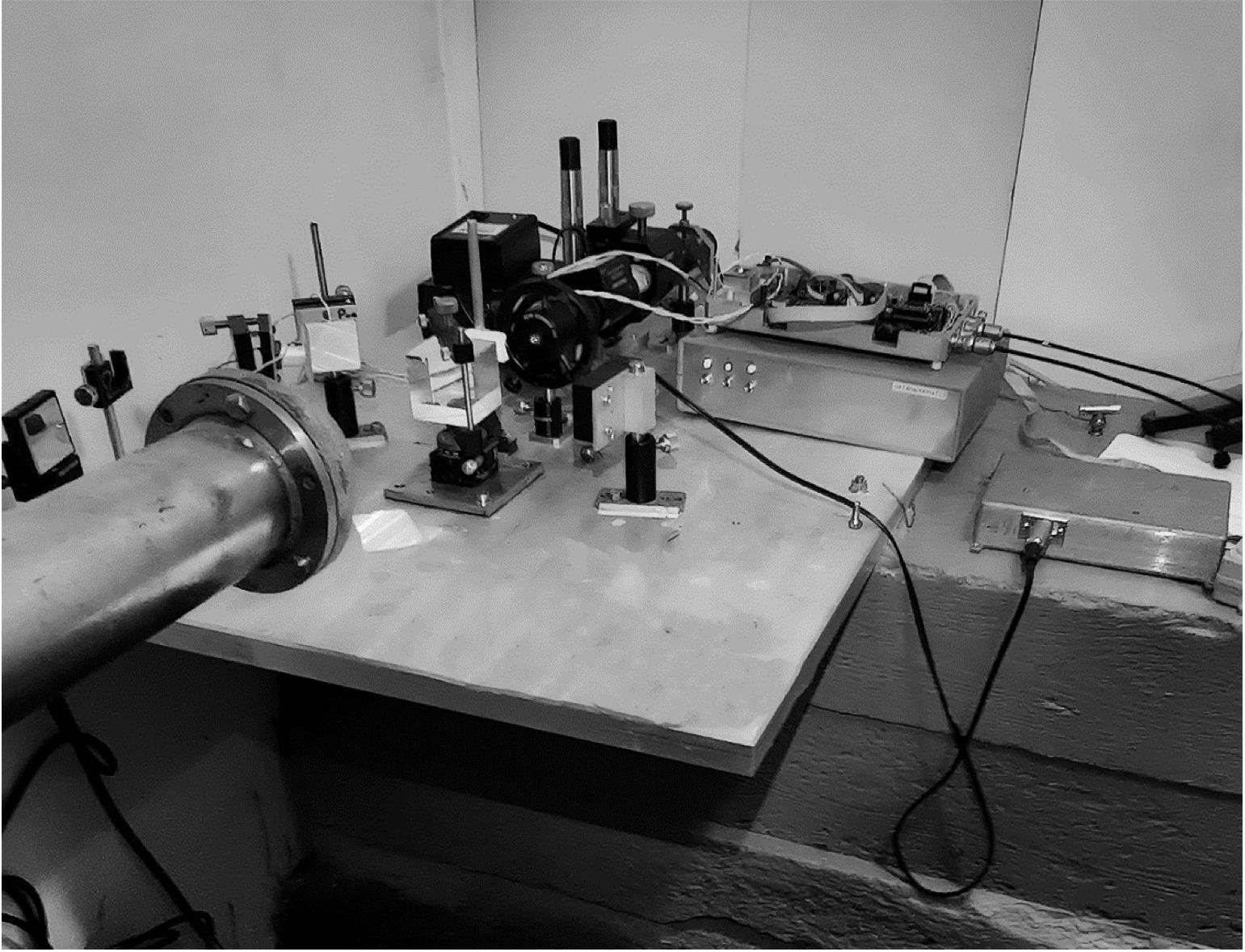Лазерный нанобарограф [11] создан для исследований взаимосвязи между процессами в атмосфере, литосфере и гидросфере. В качестве датчика-измерителя атмосферного давления в лазерном нанобарографе используется блок анероидных коробок, применяемый в классических стрелочных барометрических приборах. С целью увеличения чувствительности при регистрации перемещения незакрепленного конца блока анероидных коробок применены лазерно-интерференционные методы, в основе которых лежит равноплечий интерферометр Майкельсона с длиной измерительного (и «эталонного») плеча 20 см. В качестве источника излучения используется частотно-стабилизированный гелий-неоновый лазер фирмы Melles Griot, обеспечивающий стабильность частоты в девятом знаке. Общий вид лазерного нанобарографа приведен на рис. 3. Его основные технические характеристики: рабочий диапазон частот от 0 (условно) до 1000 Гц, точность измерения вариаций атмосферного давления 1 мПа.