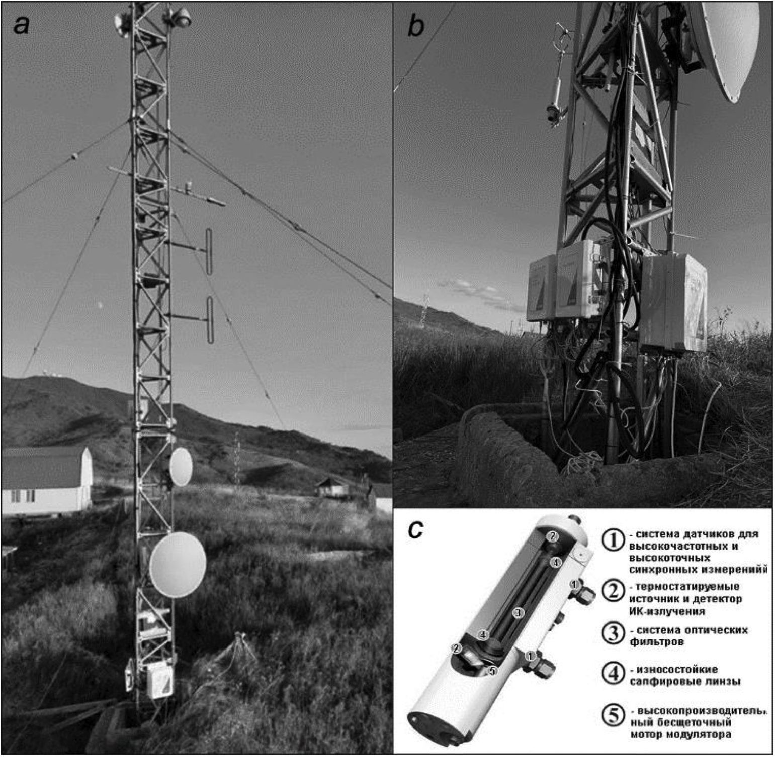Стационарный газоанализатор СО2/H2O закрытого типа LI-7200 RS. В 2023 г. на МЭС «м. Шульца» установлена станция Eddy Covariance на основе газоанализатора CO2/H2O закрытого типа LI-7200RS, модель LI-7200RSF, LI-COR, модуль воздушного потока 7200-102 (рис. 6, а). Станция оснащена системой обработки данных SmartFlux 2 для систем Eddy Covariance в режиме реального времени. Частота измерений газоанализатора 5–20 Гц. Диапазон измерений по CO2 составляет 0–3000 ppm. Чувствительность измерений по CO2 (моль H2O/моль CO2) ± 0,02. Станция оборудована высокоточным цифровым 3-осевым (3D) ультразвуковым анемометром Gill Windmaster 3D для измерения турбулентных потоков, его основные характеристики: частота дискретизации 20 Гц, диапазон измеряемых скоростей ветра 0–45 м/с, разрешение 0,01 м/с, погрешность (RMS) 1,5% при 12 м/с, рабочий диапазон направлений ветра 0–359°, разрешение 0,1°, погрешность 2° при 12 м/с, материал исполнения корпуса – алюминий/углеволокно. Оборудование от производителя LI-COR, газоанализатор CO2/H2O закрытого типа LI-7200RS специально разработан для проведения высокоскоростных и высокоточных измерений концентраций CO2 и паров воды в атмосфере (рис. 6, b). Он сочетает преимущества газоанализаторов закрытого типа (высокую точность измерений, производительность, компактность и устойчивость к самым неблагоприятным условиям) с низким энергопотреблением газоанализаторов открытого типа.