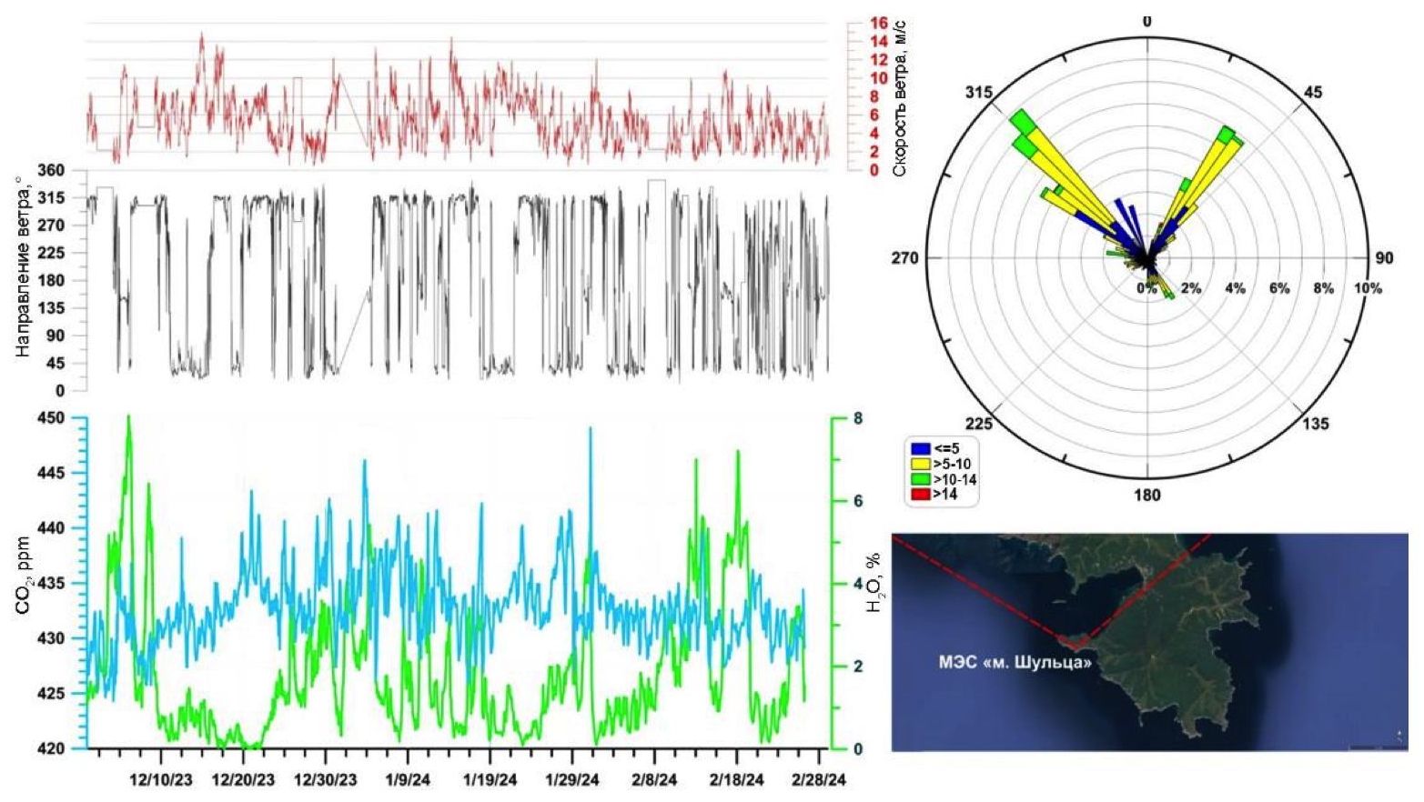 В целом подобный уровень концентраций СО2 достаточно ярко иллюстрирует повышенный уровень его содержания в атмосфере в зимний период. Этот факт обусловлен как особенностями атмосферного переноса (в основном с континентальной части), так и практически полным замедлением процессов фотосинтеза и вегетации растений (сток углекислого газа затруднен) вследствие низких температур. Также начиная с декабря 2023 г. была обнаружена характерная внутрисуточная изменчивость концентраций углекислого газа с их повышением в дневное время и плавным уменьшением ночью (с минимумом в утренние часы) со средней амплитудой 1,3 ppm. По всей видимости, это может быть связано с местными особенностями циркуляции атмосферы и сменой направления преобладающего ветра в системе суша – море.