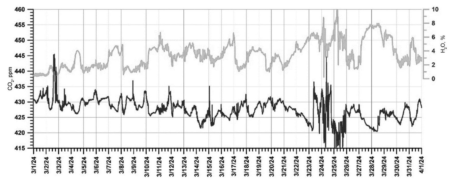В марте 2024 г. были получены первые региональные данные по концентрациям СО2 за весенний период (рис. 9). Содержание углекислого газа в марте изменялось в диапазоне 388,9–445,5 ppm, в среднем 427,5 ppm, медиана 427,8 ppm. Содержание паров воды изменялось в пределах 0,2–10,6%, в среднем 3,5%, медиана 3,3%. В целом наблюдаются сходные внутрисуточные зависимости и для данного сезона года.