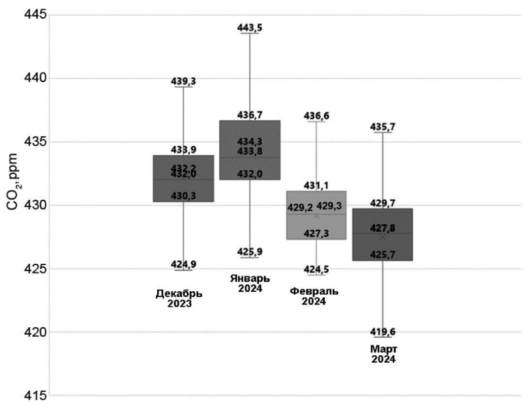Рис. 11. Параметры статистической оценки для концентраций углекислого газа. Границами бокс-плота служат первый и третий квартили (25-й и 75-й процентили соответственно), линия в середине ящика – медиана (50-й процентиль). Концы «усов» – минимальное и максимальное наблюдаемые значения данных; превышающие эти значения относятся к категории выбросов
