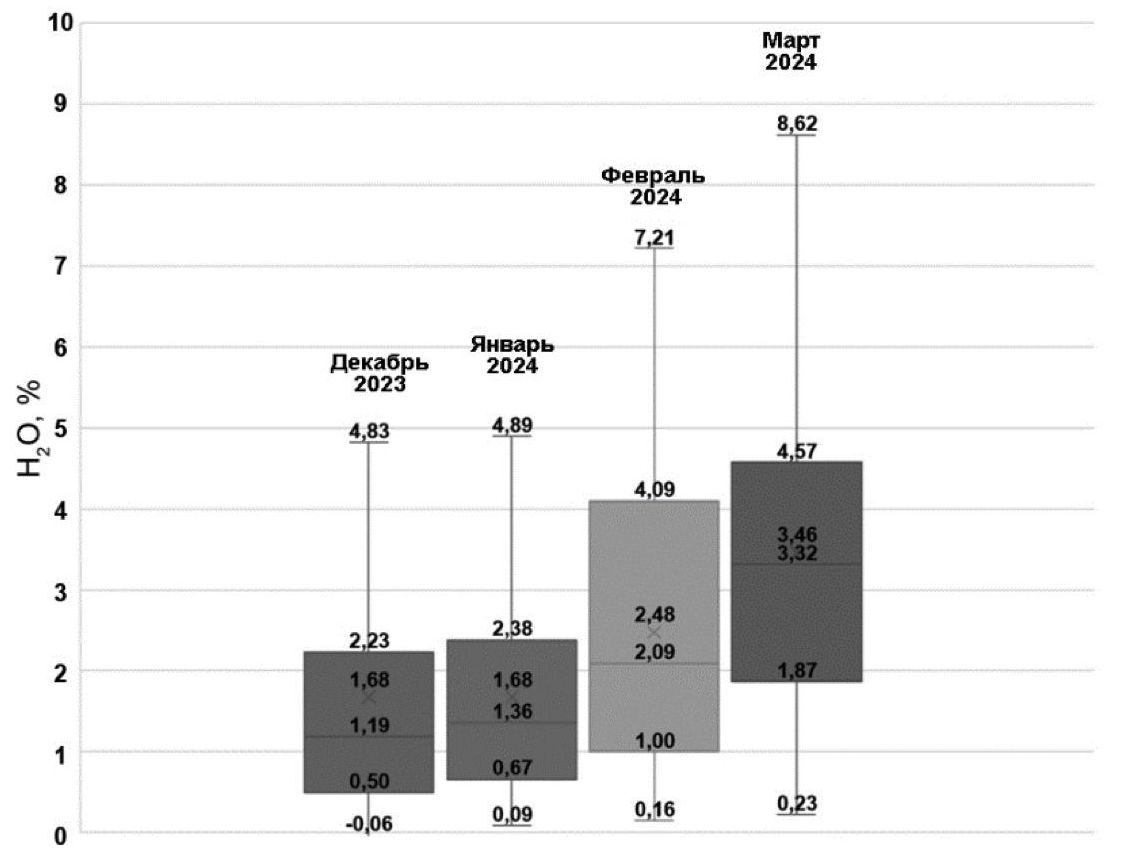 Содержание паров воды в зимний период изменялось в пределах 0,1–8,1%, в среднем 2,2%, медиана 2,8%. Максимальные среднемесячные значения зафиксированы в феврале, минимальные – в декабре и январе. Стоит отметить, что пики обоих газовых компонентов часто совпадают, однако встречается и противоположная зависимость.