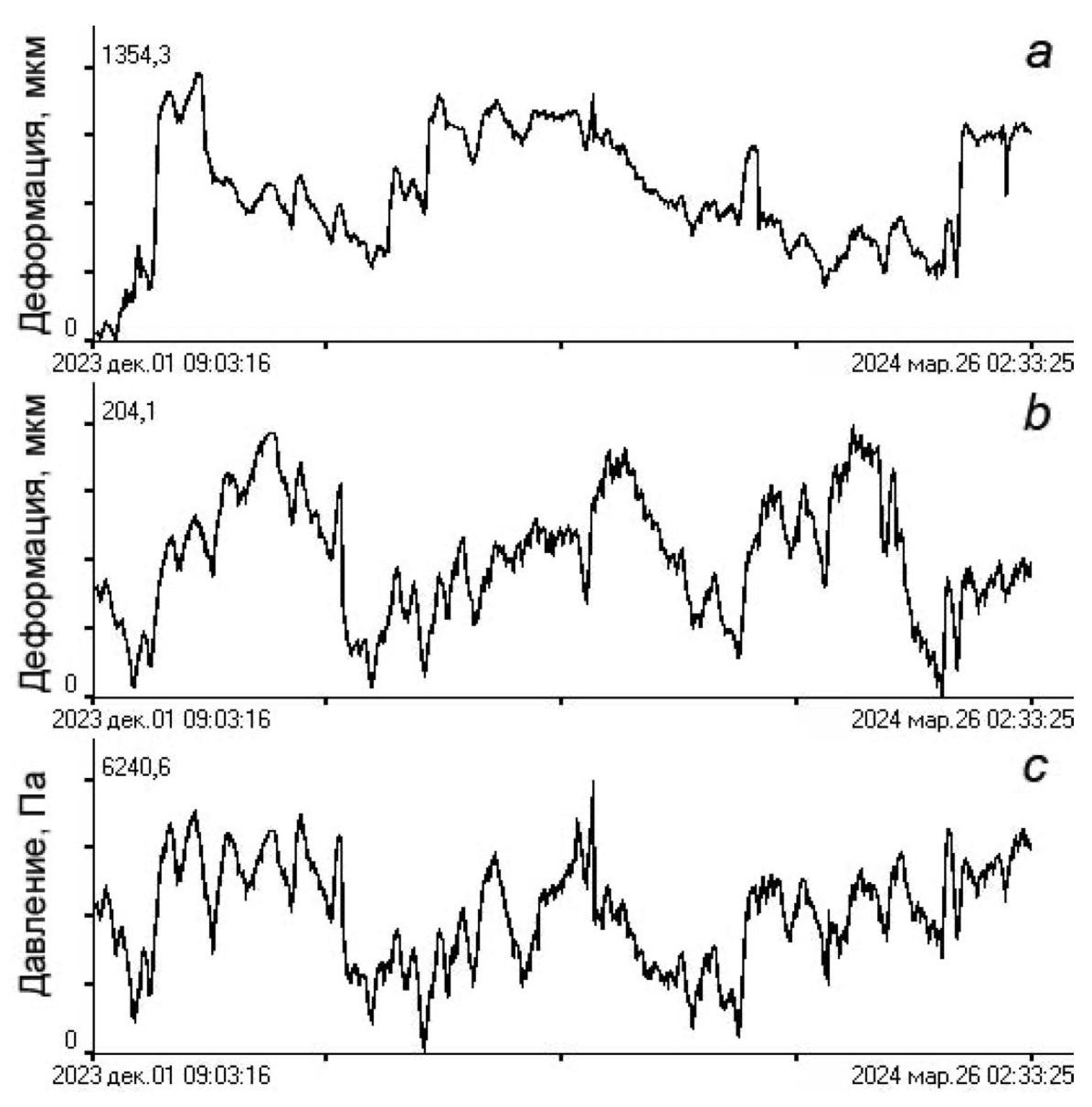 Fig. 13. Results of deformation monitoring from December 1, 2023 to March 26, 2024: records of 52.5 m (а) and 17.5 m laser (b) strainmeters, and laser nanobarograph (c)
