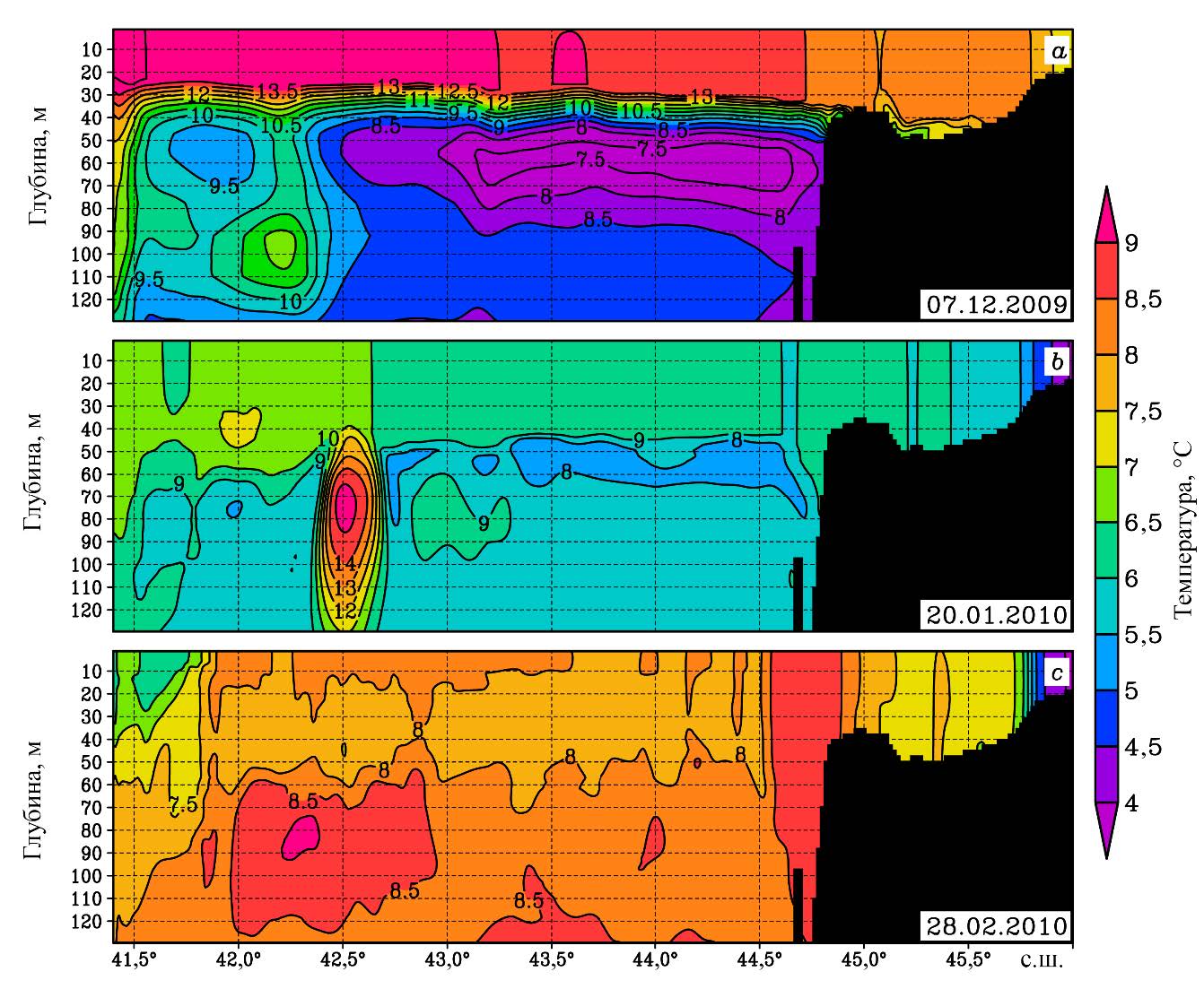 Рис. 5. Температура воды на вертикальном разрезе, проведенном по 43,5° с. ш., для тех же сроков, что на рис. 4. Черным цветом закрашена суша