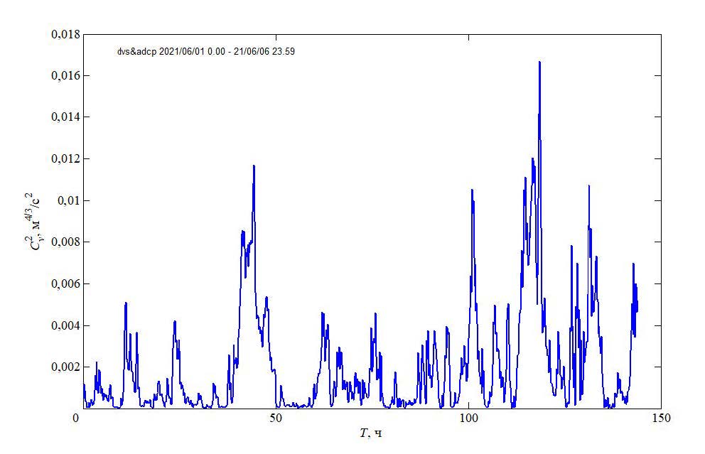 Рис. 4. Продольный структурный параметр пульсаций скорости течения с осреднением по 10 мин на глубине 5 м в районе океанографической платформы 1–6 июня 2021 г.