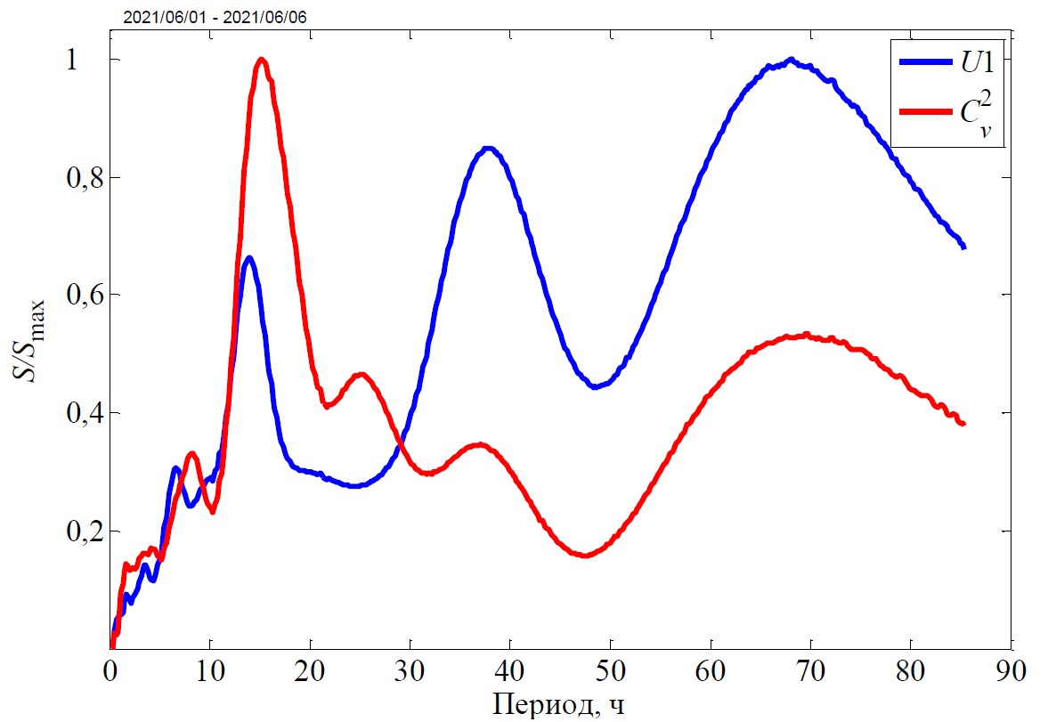 Как видно из рис. 5, в спектре существует ярко выраженный максимум на периоде ~ 15 ч, т. е. на отрезке времени протяженностью несколько суток такие структуры явным образом доминируют. Но если рассматривать менее длительные отрезки, в частности внутрисуточные колебания интенсивности пульсаций скорости, отчетливо прослеживаются масштабы с периодами 1,5 и 3,5 ч. Напомним, что значимыми на глобальном спектре считаются те максимумы, которые превышают уровень «красного шума». Вид спектра скорости течения отличается от спектра структурного параметра, что видно из рис. 6, где представлены нормированные на максимальное значение глобальные спектр и спектр скорости течения, рассчитанный по значениям модуля скорости. Вклад течений в турбулизацию на бо́льших временны́х масштабах (пики ~ 40 и ~ 70 ч) был значительно ниже, чем на масштабе 15 ч, о чем можно судить по уровню спектральной функции.