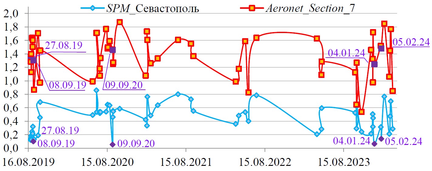 Цель исследования – проведение сравнительного анализа и оценки значений параметра Ангстрема, полученных на черноморских станциях Севастополь и Section_7 сети AERONET с весны 2019 г. по весну 2024 г. с использованием данных спутникового и наземного мониторинга, а также результатов моделирования динамики атмосферы.