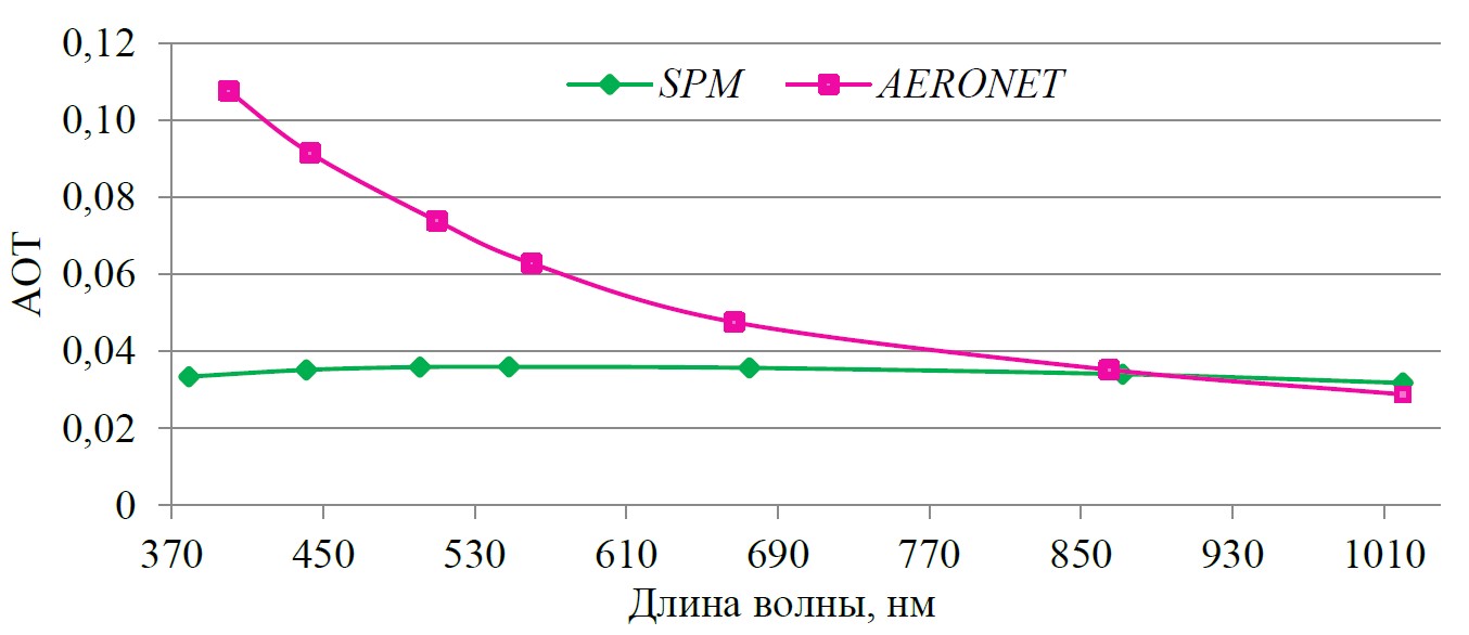 В настоящей работе для расчета АОТ используются измерения фотометров (SPM и CIMEL) на длинах волн l в диапазоне 340−2134 нм, за исключением канала 936 нм, по измерениям на котором определяют содержание паров воды в столбе атмосферы [17, 22, 23].