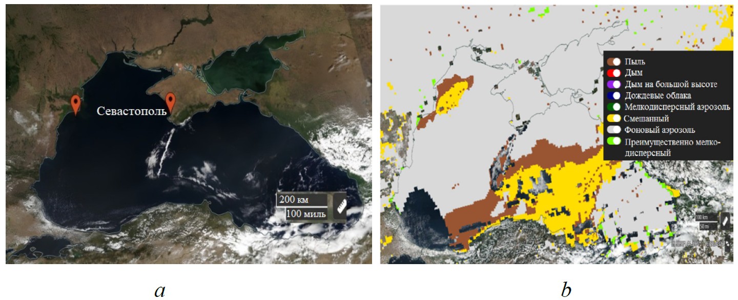 Анализ спутниковых изображений 09.09.2020 показал, что атмосфера над акваторией Черного моря была чистой (облачность минимальная) (рис. 3, а). Для всех исследуемых областей региона Черного моря по алгоритму DB был определен преимущественный тип аэрозоля за этот день: над западной частью Черного моря – пылевой и смешанный, а над станцией Севастополь − фоновый (рис. 3, b).