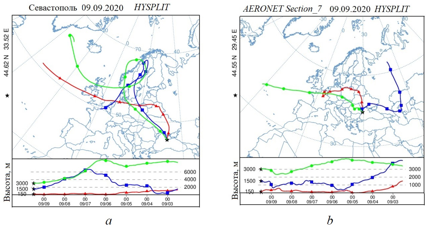 Fig. 4. Reverse trajectories of air flow transfer based on the results of HYSPLIT modeling for the stations of AERONET network: Sevastopol (а) and Section_7 (b) for 09.09.2020 (URL: http://ready.arl.noaa.gov/HYSPLIT.php)