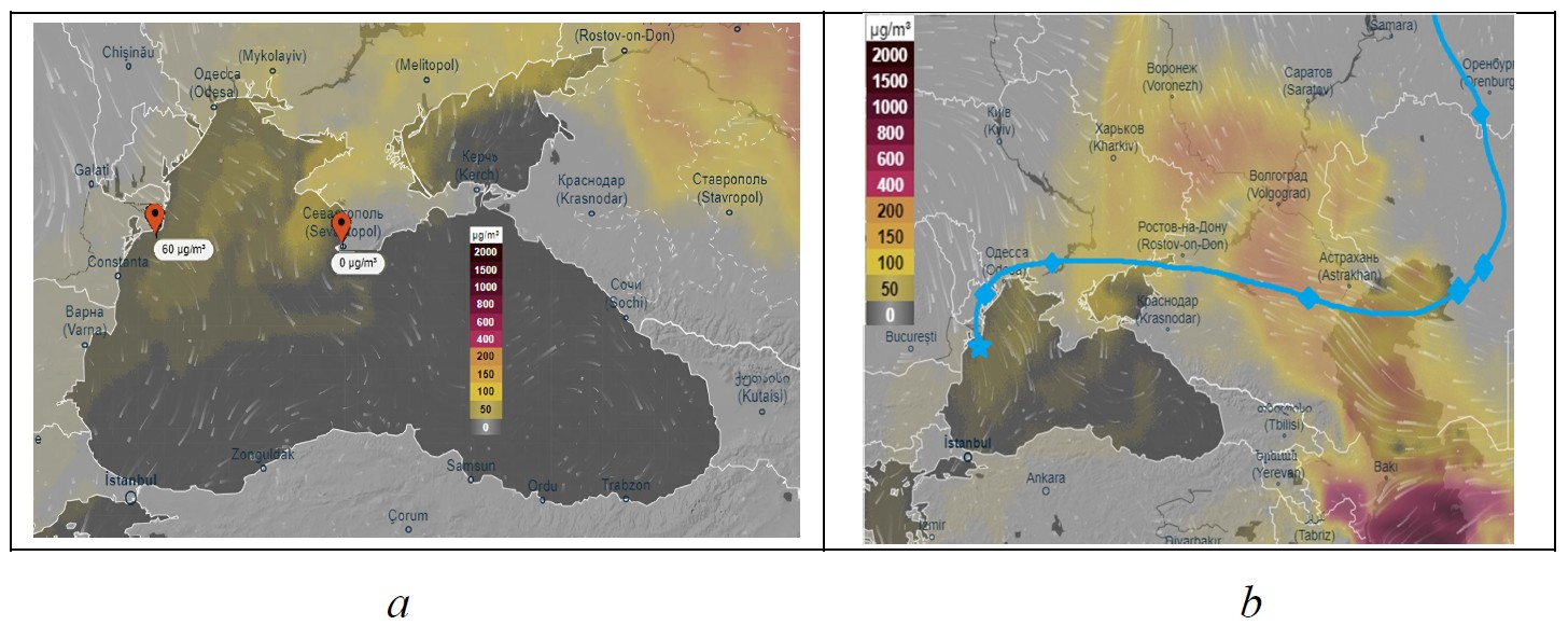 По данным модели SILAM о загрузке пылевым аэрозолем были получены концентрации пыли для обеих станций. Как видно из рис. 5, а, на станции Севастополь за 09.09.2020 концентрация пыли нулевая (пыль не обнаружена), тогда как на западной черноморской станции ее значение в 14:00 достигало 60 мкг/м3. Согласно рис. 5, b, источник пылевой активности за этот день переместился со стороны пустыни Каракумы вдоль Каспийского моря в сторону северо-запада, а обратные траектории по результатам модели HYSPLIT для станции Section_7 проходили именно через область облака пыли (см. рис. 4, b).
