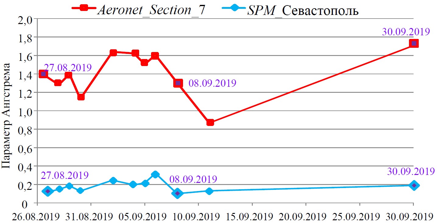 Рис. 6. Параметр Ангстрема для станций сети AERONET Севастополь и Section_7 с 27.08.2019 по 30.09.2019