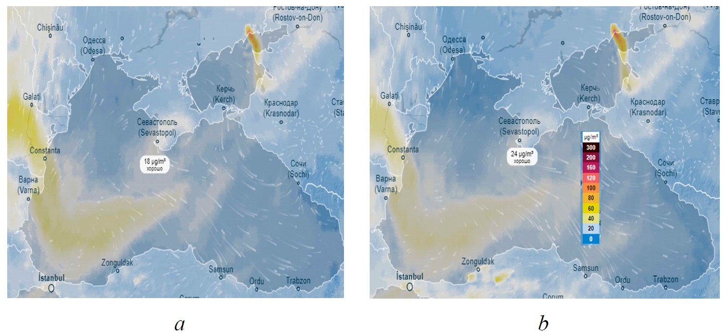 Рис. 7. Результаты моделирования концентрации частиц РМ2.5 (а); РМ10 (b) по данным SILAM на 22:00 29.11.2021