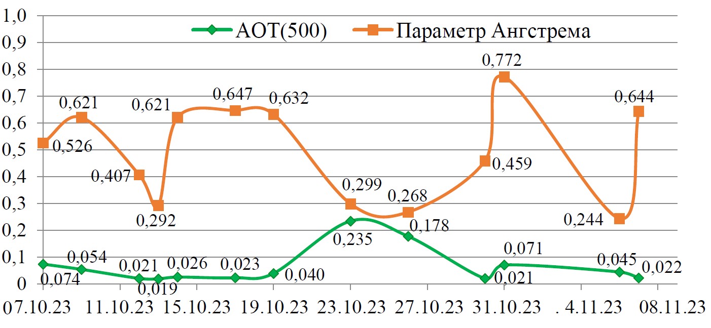 В период с 07.10.2023 по 07.11.2023 были получены аномально низкие значения параметра Ангстрема и АОТ (рис. 8). Из 13 дней измерений только за один день (23.10.2023) значения аэрозольной оптической толщины (АОТ(500) = 0,26) превышали фоновые, однако значения параметра Ангстрема (α = 0,3) и за этот день были намного ниже фонового значения (α = 1,25). Солнечная ясная погода наблюдалась 23.10.2023 до 14:00. Именно в этот дневной промежуток были получены отличающиеся от фоновых значения основных оптических характеристик, что соответствует присутствию в атмосфере аэрозоля, например пылевого аэрозоля или дыма. При этом, по данным детектора Espada М3, значения концентрации частиц PM2.5 не превышали 12 мкг/м3, а PM10 – 13 мкг/м3.
