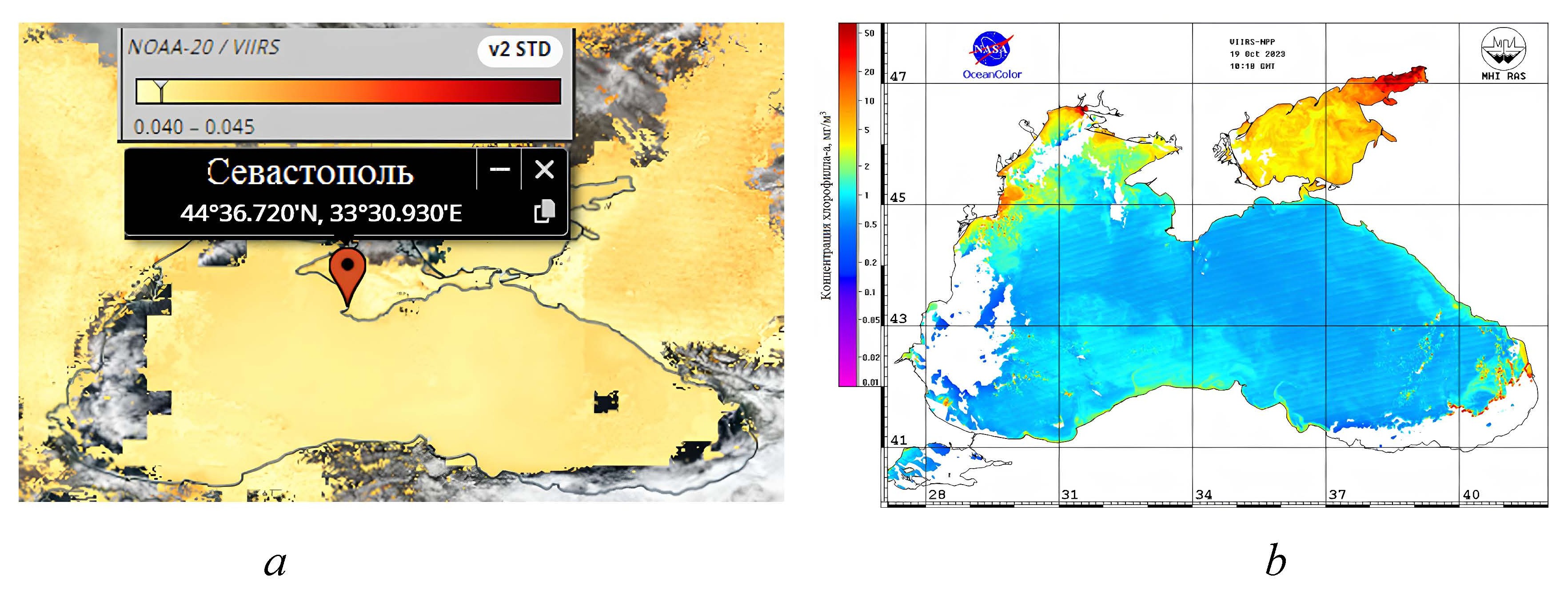 Fig. 10. Spatial distribution of aerosol optical depth at a wavelength 500 nm (а) and chlorophyll a concentration based on the VIIRS satellite data obtained over the Black Sea region (b) for 19.10.2023