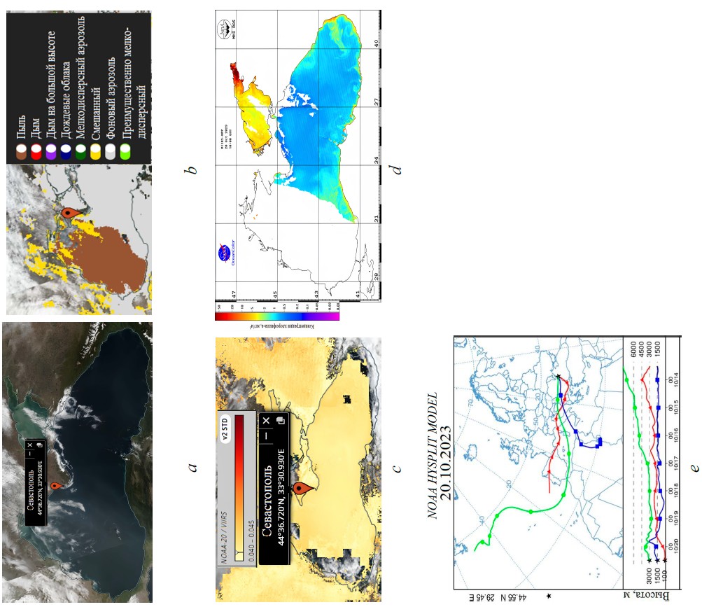 Рис. 11. Спутниковое изображение: цветосинтезированное в естественных цветах (TrueColor) (а), полученное по алгоритму Satellite Ocean Aerosol Retrieval (b), по спутниковым измерениям АОТ(500) (с), концентрации хлорофилла а (d) по спутниковым данным VIIRS за 20.10.2023 над Черноморским регионом; обратные траектории переноса воздушных потоков по результатам моделирования HYSPLIT для западной черноморской станции