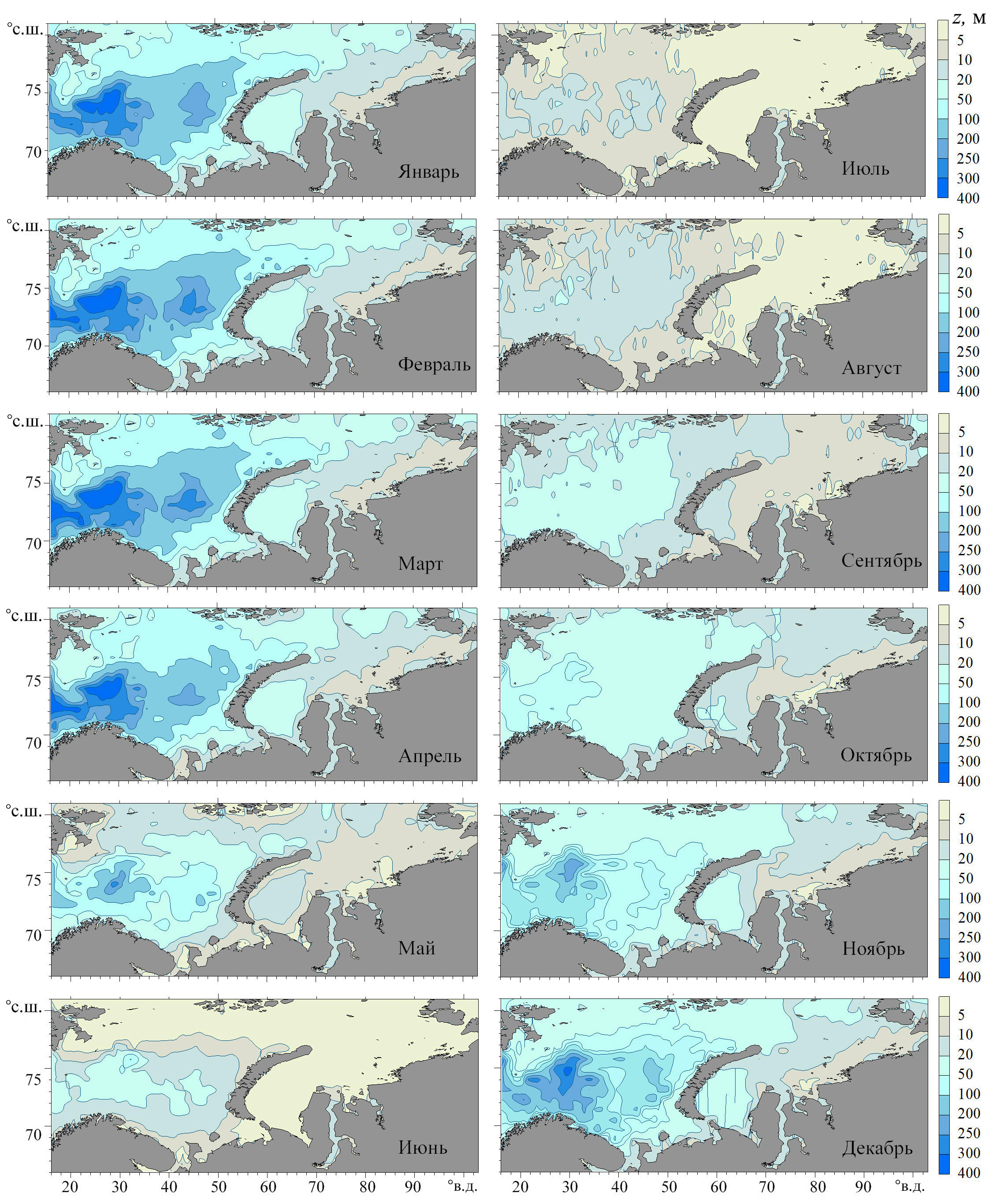 В холодное полугодие (ноябрь – апрель) наибольшая толщина ВКС (360–390 м) отмечается в наиболее глубоководных районах Баренцева моря (Западный желоб, Центральная котловина) с максимумом в феврале и марте (рис. 2). Это район распространения незамерзающих атлантических вод, где ветер и температура воздуха являются наиболее важными факторами, определяющими интенсивность стратификации. Зимой сильные ветры и низкие температуры могут вызвать перемешивание до глубин более 200 м [20].