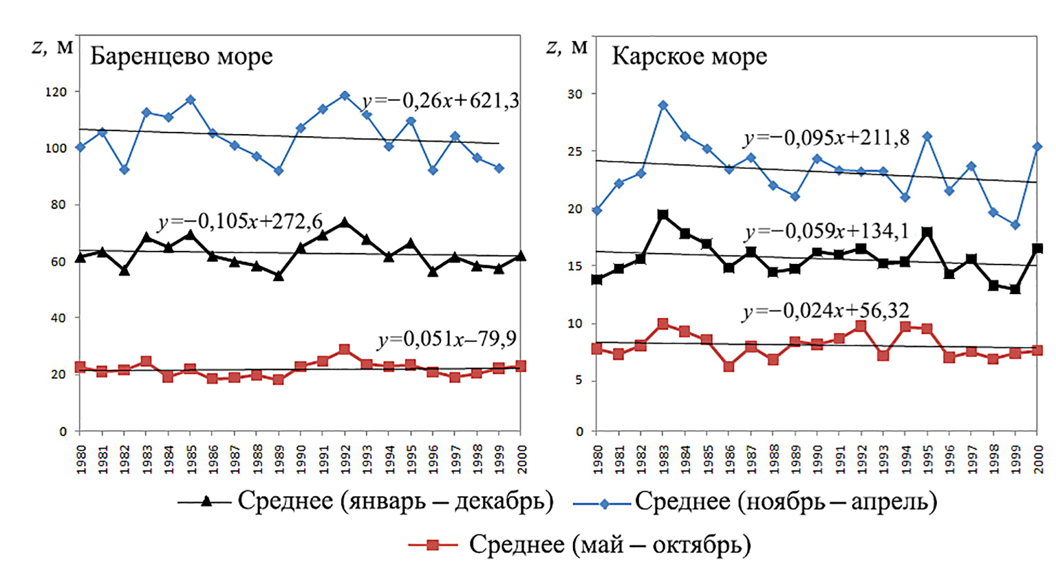 Для анализа межгодовой изменчивости перемешанного слоя были рассчитаны средние значения толщины ВКС в Баренцевом и Карском морях за холодное (ноябрь – апрель) и теплое (май – октябрь) полугодия. Найдены значения толщины этого слоя для западного (65–80° с. ш.; 16–36° в. д.) и восточного (65–80° с. ш.; 36–56° в. д.) районов Баренцева моря, а также для западного (65–80° с. ш.; 56–80° в. д.) и восточного (65–80° с. ш.; 80–103° в. д.) районов Карского моря.