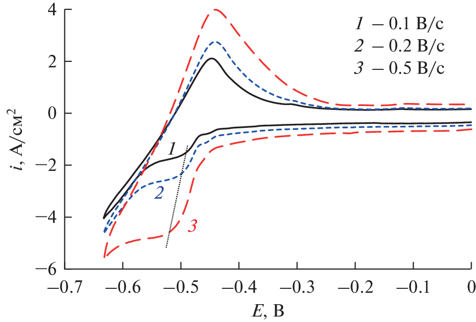 The electrochemical behavior of scandium in halide melts is of interest both from the point of view of developing new electrochemical methods for producing scandium and its materials, and from the point of view of simulating electrochemical behavior of fission products during pyrochemical processing of spent nuclear fuel in molten salts. Using the methods of cyclic voltammetry, square-wave voltammetry and chronopotentiometry, the regularities of electrical reduction of scandium ions depending on the electrolysis parameters of the LiF–CaF2–ScF3 melt at a temperature of 800°C were studied. It is shown that the electrical reduction of scandium in the melt under study occurs at potentials more negative than –0.45 V relative to the potential of the aluminum electrode, while the electrodeposition of scandium on the electrode contributes to the electrical reduction of lithium cations with depolarization. When analyzing the obtained polarization dependences, it was noted that the process of electroreduction of scandium proceeds in one 3-electrode stage, while it is not electrochemically reversible. It has been suggested that the cause of irreversibility is the stage of formation of a new phase. As a result of electrochemical measurements, it was concluded that, due to the wide “electrochemical window”, the LiF–CaF2 melt can be used both for the electrochemical synthesis of scandium and studying regularities of the selective electroreduction or co-electroreduction of minor actinides and lanthanides.