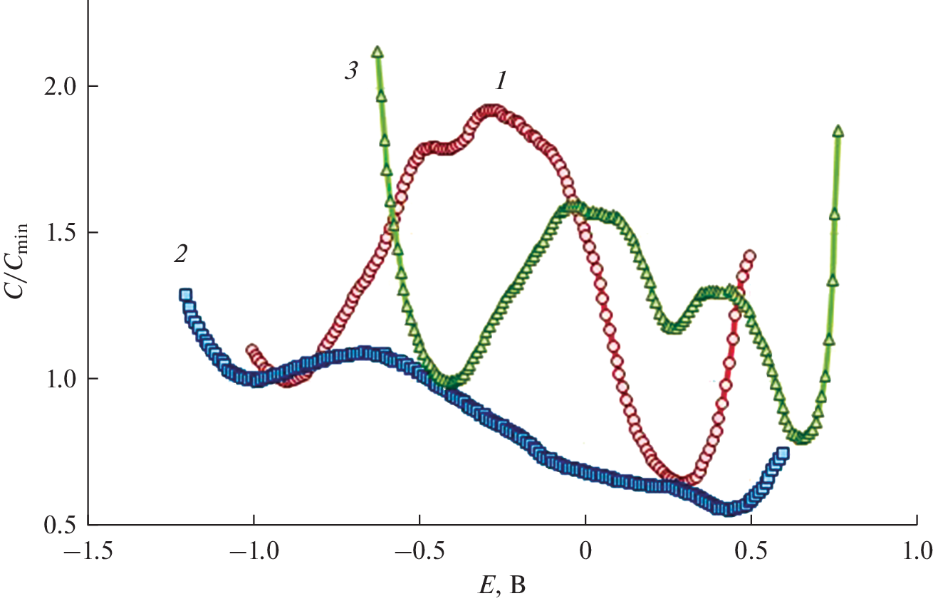 Сapacitance of the iridium electrode was studied by the electrochemical impedance spectroscopy with variation of the main physical and chemical parameters: electrical potential, temperature, radius of the alkali cation. The influence of the signal frequency used in AC electrochemical methods on the capacitance value and the shape of the curve was also checked. Capacitance of the iridium electrode was obtained in molten sodium, potassium and cesium chlorides in the temperature range 1093–1123 K and the frequency range of the AC signal 3 · 100–3 · 104 Hz in the entire accessible range of electrical polarization. The obtained capacitance curves have two main minima with a maximum between them. One of these minima (cathodic one) was identified as the classical potential of minimum capacitance. A decrease in the signal frequency and the temperature of experiment, as well as an increase in the cation radius in the NaCl–KCl–CsCl order, leads to the appearance of one or two additional minima in the potential region between the main minima. The depth of these intermediate minima increases and their potential shifts in the positive direction with an increase in the radius of the alkali metal cation of the salt electrolyte. The calculated values of the capacitance of the electrical double layer and the adsorption capacitance were obtained by the method of equivalent electrical circuits. One of the additional minima obtained by direct measurement of the dependence of the electrode capacitance on the potential at a high AC frequency corresponds to the calculated capacitance of the double layer. The other additional minimum obtained at a low AC frequency corresponds to the calculated adsorption capacitance.