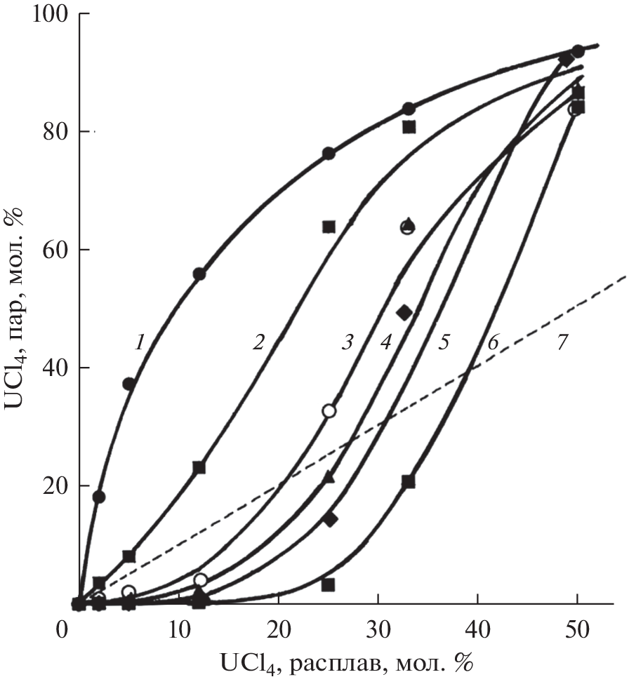 Based on our experimental data and those obtained by researchers, mainly employees of our Institute (IHTE UB RAS), the regularities of changes in the composition of saturated vapors and the volatility of components of molten mixtures of tetrachlorides of uranium and some other metals (ThCl4, HfCl4, ZrCl4, TiCl4) with alkali metal chlorides depending on the temperature, concentration and cationic composition of melts are discussed. It is noted that the dissolution of UCl4 as well as other tetrachlorides in molten alkali metal chlorides is accompanied by complexation, manifested in a sharp decrease in the volatility of the corresponding tetravalent metal chloride and its content in saturated vapors. The strength of the complex chloride anions of polyvalent metals formed in melts increases significantly with a decrease in their concentration, replacement of the solvent salt in the series from LiCl to CsCl and temperature. As a result, the volatility values of UCl4, ThCl4, HfCl4, ZrCl4, TiCl4 and the composition of vapors above their solutions in ionic melts vary greatly. At the same time, according to the experimental data hafnium, zirconium and titanium tetrachlorides (especially TiCl4), which are much more volatile in the individual state, have higher volatility and content in saturated vapors over solutions in molten alkali metal chlorides.