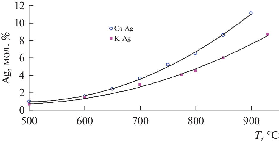 В Институте высокотемпературной электрохимии УрО РАН на протяжении ряда лет проводятся определения растворимости серебра в зависимости от температуры как в индивидуальных калии и цезии, так и с добавками к этим щелочным металлам их галогенидов. В начале исследования предполагались как коррозионные, вследствие сложившегося мнения в литературе о малой растворимости серебра в калии и еще меньшей в цезии. В данной работе показано, что растворимость серебра в цезии больше чем в калии. Здесь представлены измерения растворимости серебра в жидком цезии при температурах от 500 до 900°С. Средняя для каждой температуры величина растворимости изменялась от 0.94 до 11.1 мол. % Ag соответственно. Экспериментальные данные по растворимости серебра в цезии аппроксимированы полиномом второй степени. NAg = 6.066 · 10–5 · T 2 – 5.966 · 10–2 · T + 15.58, где NAg – растворимость серебра в мол. %, Т – температура в °С. В данной статье, используя данные по растворимости серебра в цезии и уравнение идеальной растворимости Шредера, были получены значения коэффициентов активности серебра и парциальные энтальпия смешения серебра и его парциальная избыточная энтропия в данных растворах. Они соответственно равны: \({{\overline {\Delta H} }_{{{\text{Ag}}}}}\) = 38 154.8 Дж/моль и \({{\overline {\Delta S} }_{{{\text{{\и}{з}{б}Ag}}}}}\) = = 14.215 Дж/(моль · К). Уравнение Шредера использовалось в предположении независимости энтальпии плавления серебра от температуры. Значения логарифма коэффициента активности серебра от температуры аппроксимированы уравнением: ln(yAg) = 4589 · 1/T – 1.7097. Погрешность аппроксимации R2 = 0.9818.