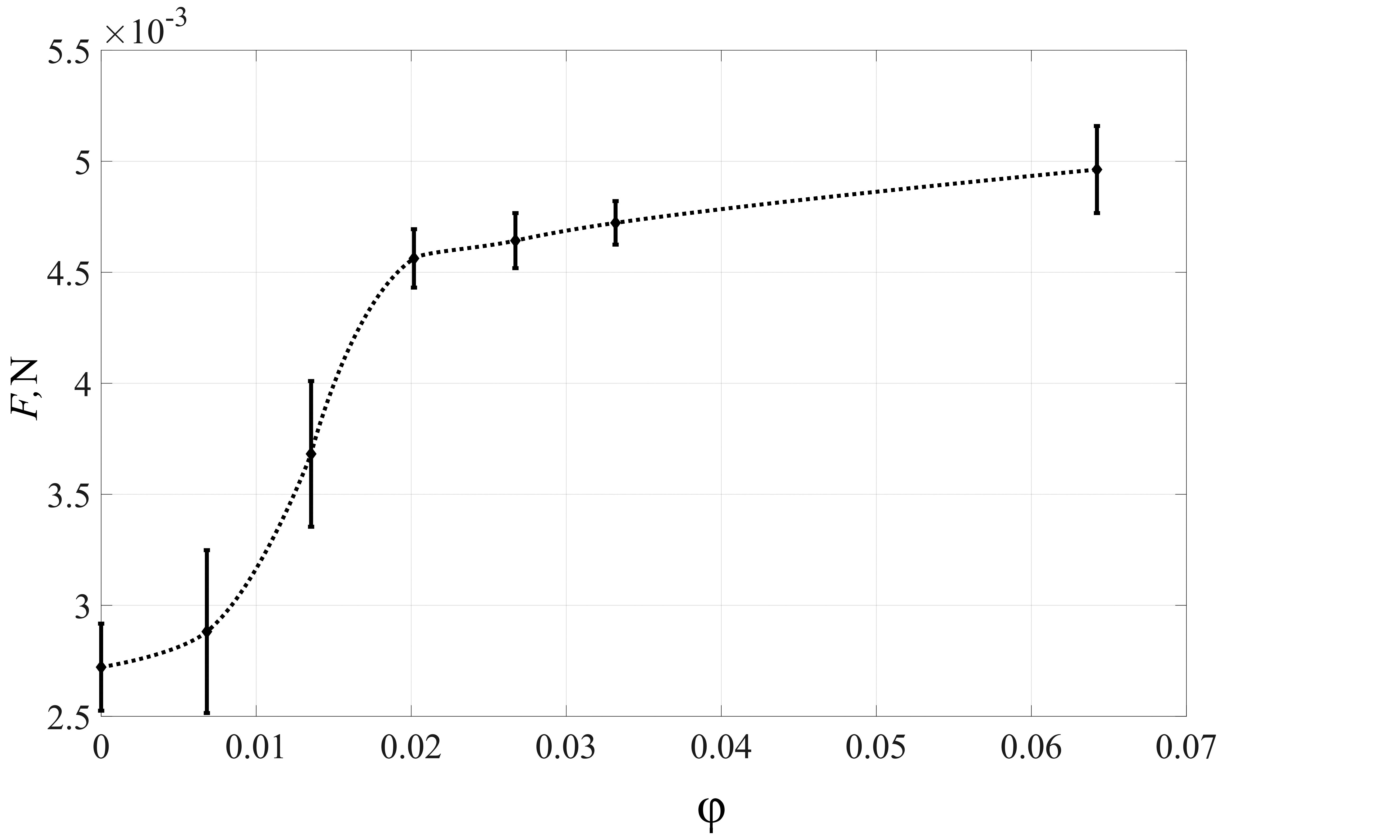 Рис. 2. Зависимость электромагнитной силы от объемной доли медных частиц (для наглядности экспериментальные точки соединены пунктирной линией).