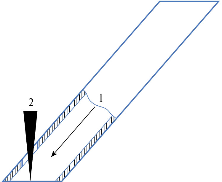 Рис. 1. Система защиты путем подачи защитного газа (1 — аргона) при работе лазерного излучателя (2) с материалом покрытия (порошок Al–Zr–V–Nb).