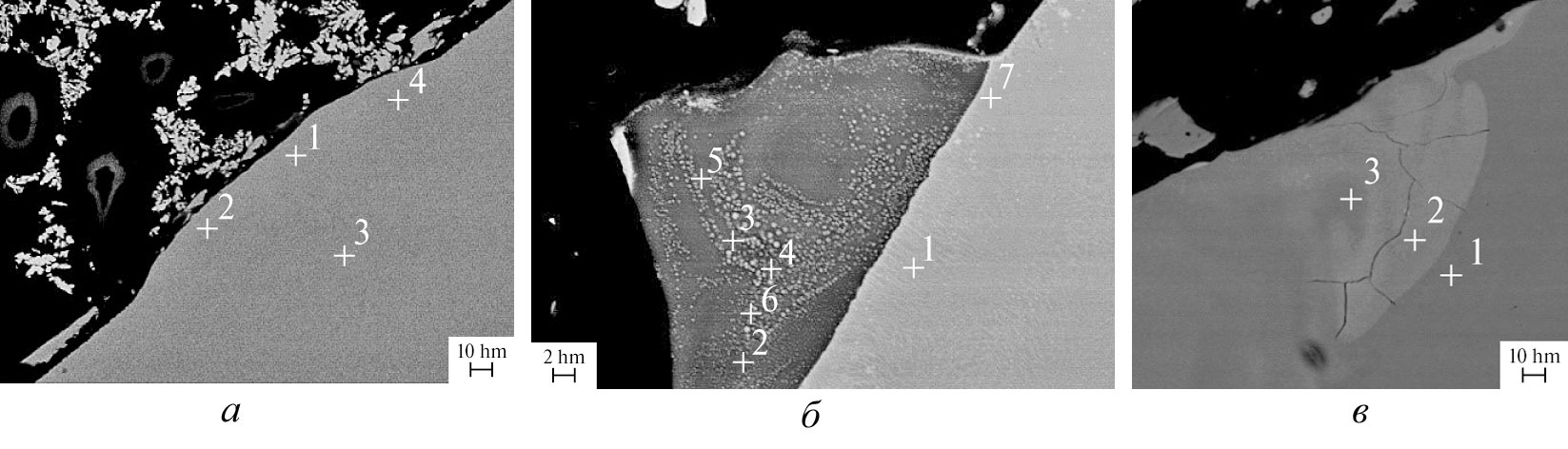 Рис. 4. Микроструктура покрытия Al–Zr–V–Nb по сечению для проходов: а — первого, б — второго, в — третьего. Цифрами изображены места измерения химического состава.