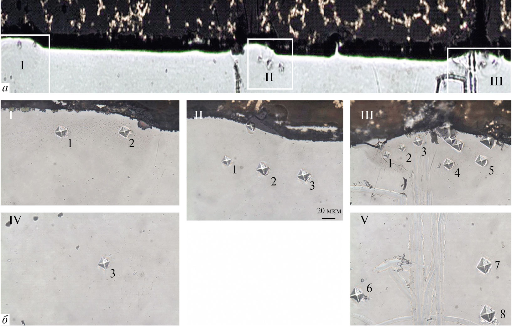 На рисунке 5б представлено увеличенное изображение образцов. Видно, что в некоторых точках зоны I и II площади отпечатка индентора минимальны, это может быть связано с частичной диффузией материала покрытия в материал подложки. Точные численные значения экспериментальных результатов по определению микротвердости методом Виккерса представлены в табл. 3.